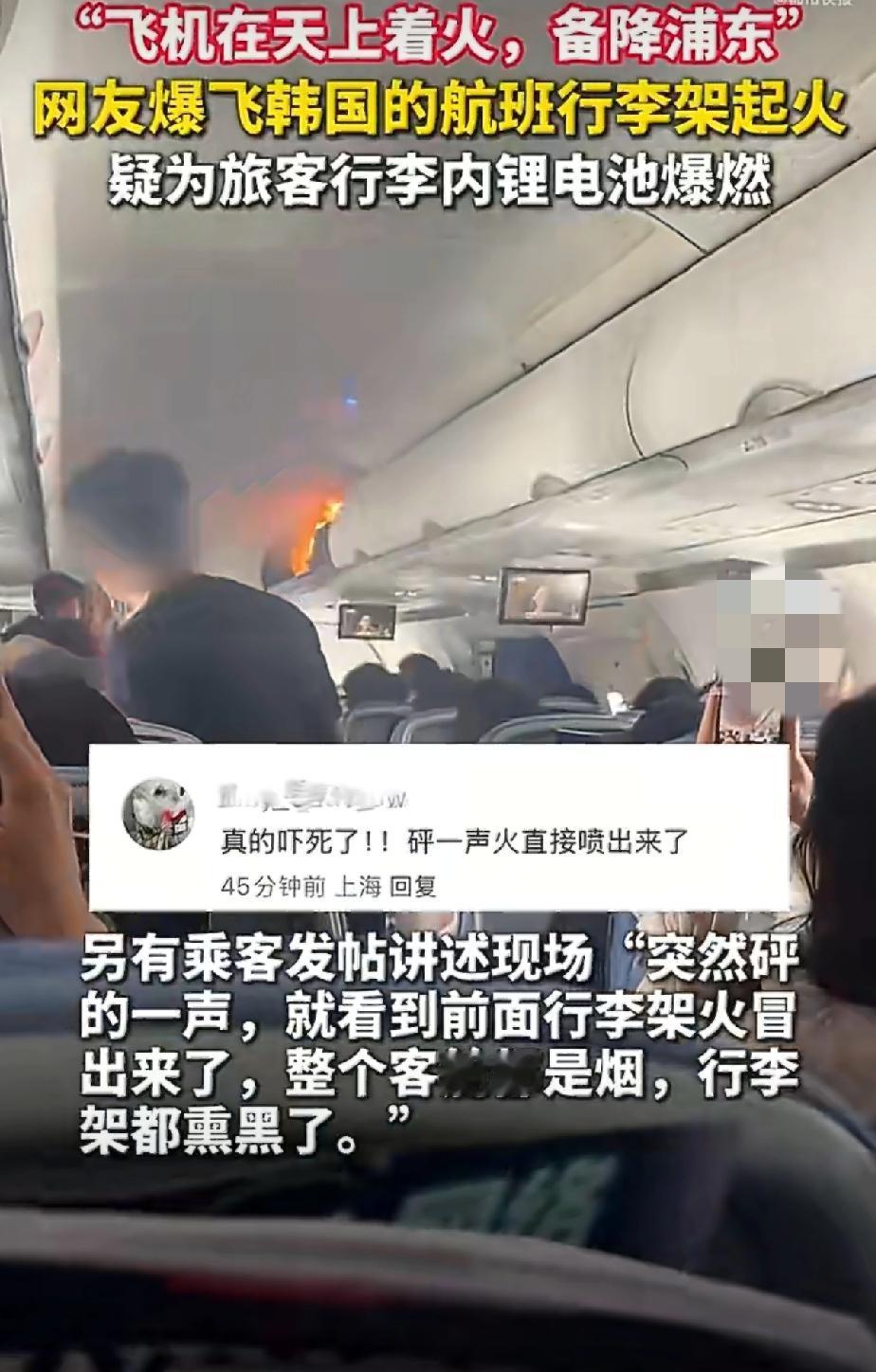 杭州飞韩国航班突发火情! 坐飞机正啃着面包呢,头顶行李架突然“砰”一声窜出火苗?
