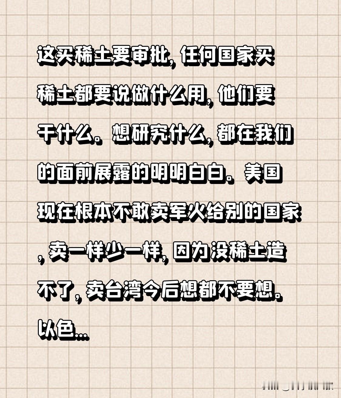 这买稀土要审批,任何国家买稀土都要说做什么用,他们要干什么。想研究什么,都在我们