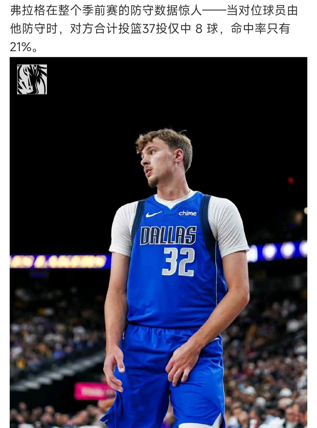 这个就是状元弗拉格吗?先吹一下他的防守能力非常强! 季前赛对位球员只有 21%命中率?? 他的进攻也很出色,爆发力强,移动速度还快,确实是一位超级状元。 期待他和文班亚马的对决,未来两大超级内线![大金牙]