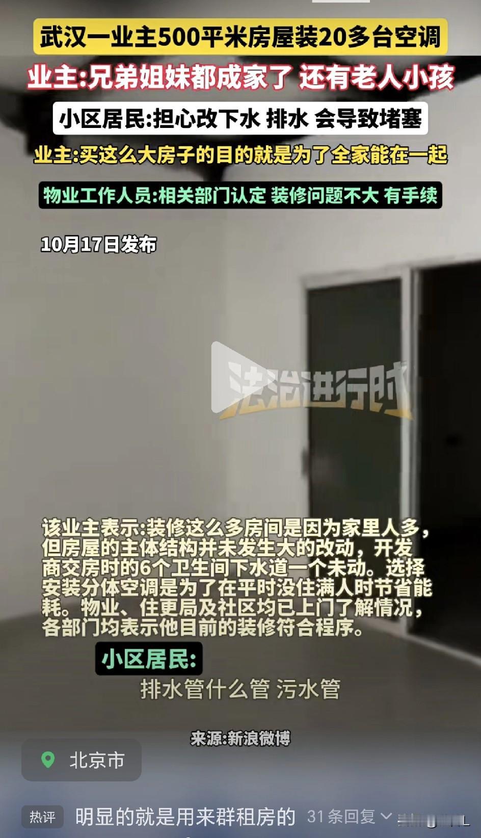 19个马桶26台空调!武汉一业主“爆改”500平豪宅,目的只为家人团聚,网友:骗鬼呢! 近日,武汉某小区500平复式房,业主将其隔成20几个房间,买来了19个马桶,安装了26台空调室外机,引发邻居对漏水、噪音及安全隐患的担忧。 房主回应说,自己兄弟姐妹都成家了,家里还有老人和孩子,把房子隔出来这么多,就为了家人团聚,兄弟姐妹回来的时候有地住。 而至于26台空调,是为了能耗考虑,节约用电,住哪个房间开哪个房间的空调。特意强调,自己未改动房屋结构及原6个卫生间。 相关部门要求房主委托第三方鉴定房屋结构安全性,社区也表示将持续关注。目前装修已暂停,但手续齐全暂无法强制干预。 网友对房主的解释,却纷纷表达不相信: “很明显就是群租房的!” “不是群租也是单位集体宿舍之类的。” “19个马桶?你家里人一天不停的上厕所啊?需要人手一个马桶?” “大概率是做直播的。” “百分百商业用途!” “6个卫生间,19个马桶?公共厕所啊?” “26个空调,光噪音就够违规了!” “或者是要干民宿吗?” “可能不道德,但是不违法,难办!” “为什么他有那么多兄弟姐妹?难道没被计划生育过?” “最怕排水出问题,对邻居影响大。” “这么大面积,不是应该装中央空调吗?” 虽然目前看房主不违法,手续齐全,但其他业主和网友的说法也有道理。 如果是为了家人团聚,如果需要20多个房间才能住的下,全家这么多人一起住,得乱成啥样? 如果只是逢年过节一起住几天,把好好的大平层隔成20几间房,是不是过于暴殄天物了? 如果真的是大家庭,有这么多家人一起住,不如买个独栋别墅了。宽敞,还不会影响楼上楼下邻居。 至于房主的真正用途,因为目前装修暂停,还不知道。 虽然说,装修自由,自己的家想怎么装就怎么装。但毕竟生活在这个社会环境中,不可能绝对的随心所欲,还是需要考虑周遭环境的影响。 事情到底是怎样的,还要再等待后继的发展,和有关部门的调查。 如果搞群租房或者直播,这个确实对环境和生活品质影响太大。 毕竟500平的大平层,是用来提升生活品质和享受生活的,如果明知有这些潜在的烦心事都不管,等装修好了,一切成定局,更是扯不完的官司! 让子弹再飞一会! 信息来源于法治进行时,侵联删!