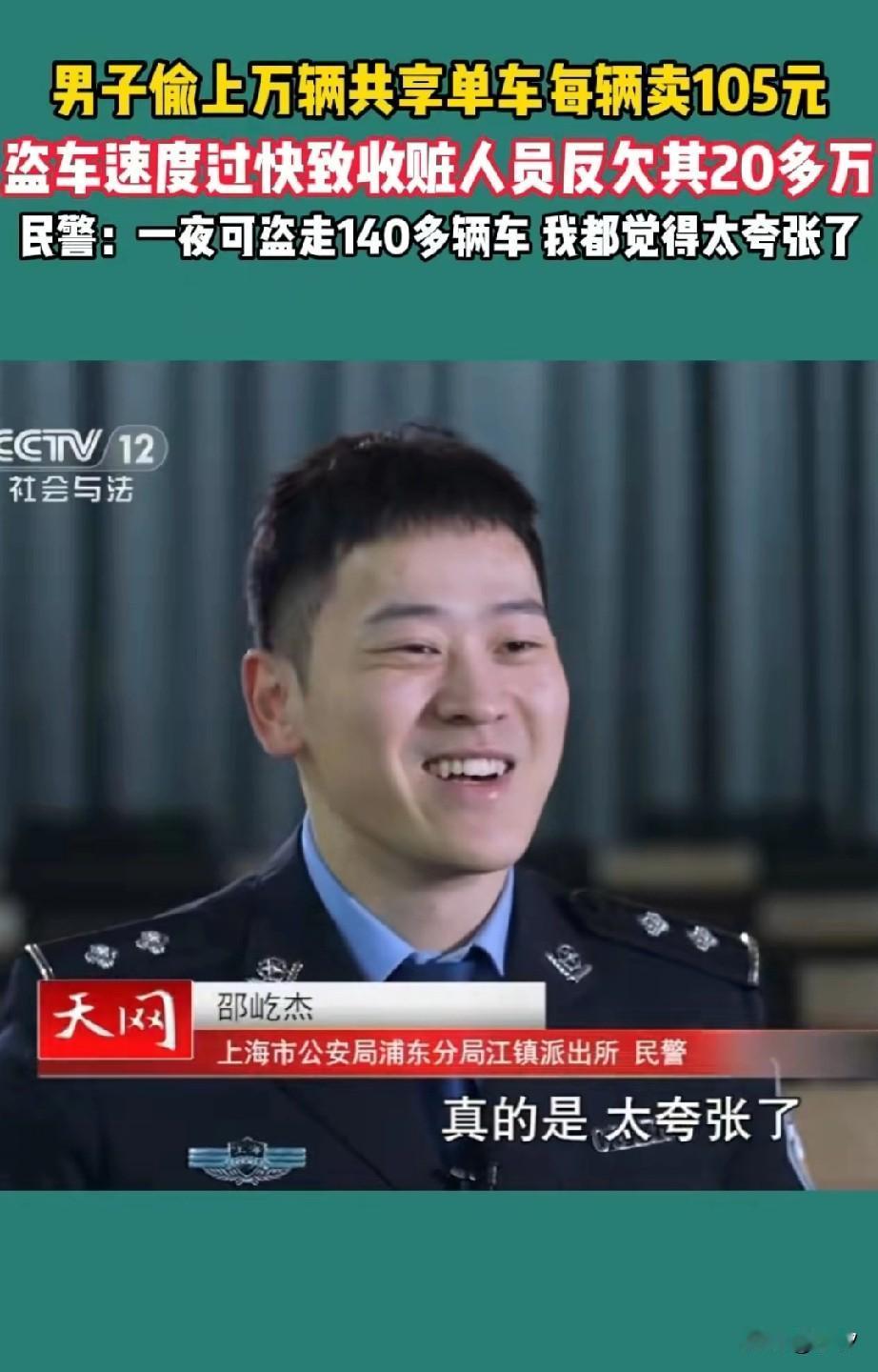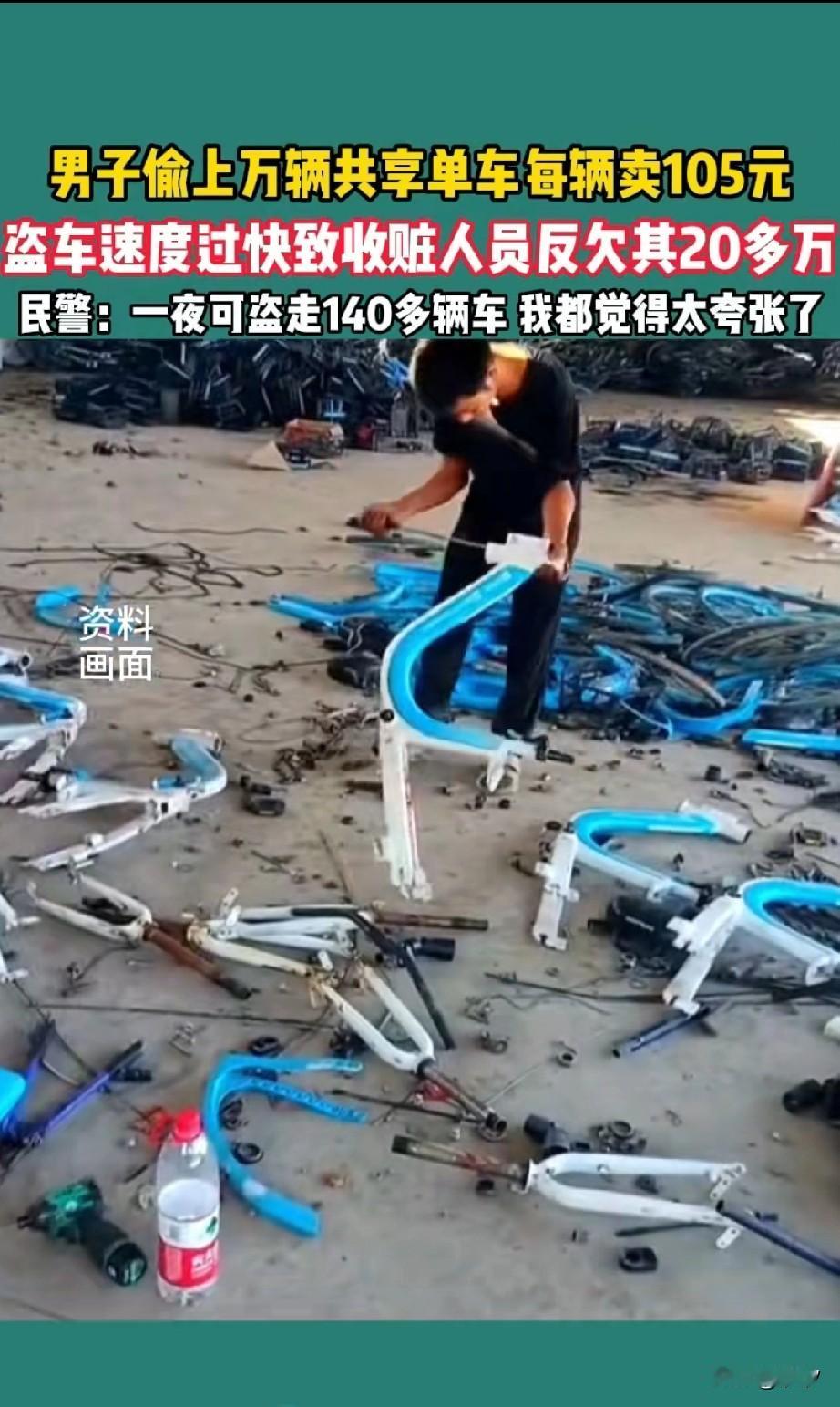 男子偷上万共享单车每辆卖105万, 导致收赃的人员反欠他20万, 帽子叔叔接受采访的时候都忍不住笑了,房门一打开真是太夸张了, 共享单车都堆成了小山, 密密麻麻的全是共享单车, 他们都不敢相信, 该男子手法娴熟, 完全能够自产自销了, 我都惊呆了, 一夜偷盗140辆, 我都惊呆了, 帽子叔叔也不自觉的笑出声来, 法网恢恢疏而不漏, 男子最终要为自己的偷盗行为买单, 大家觉得男子偷共享单车是不是太夸张了? 共享单车 共享电单车乱象 盗窃共享单车 共享单车排名 大爷偷单车 偷骑车 单车盗窃