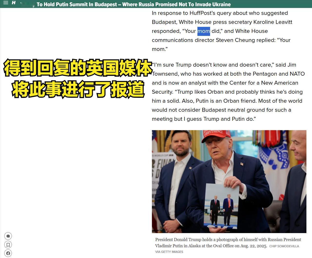 【你老母选的】白宫发言人莱维特今日回答引发争议——当时她被英国记者问及,是谁选的匈牙利首都布达佩斯为俄美首脑会晤地点。她脱口而出了这句回复。 当所有人都以为这只是莱维特个人情绪管理上问题,导致在如此正式的场合会有如此粗鄙的回复时——白宫通讯主任史蒂芬-张,同样延续了【你老母选的】这回复,令所有人都不敢相信。 这群草台班子,打算又一次闪瞎全世界人的眼睛。毕竟哪怕在英语语境中,用人家娘来回答也是充满了攻击性与羞辱感——无法理解他们在想什么。