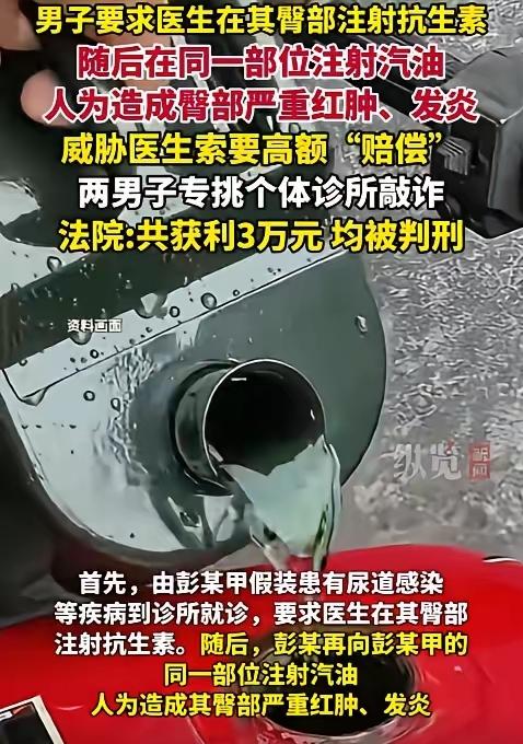 “太可恶了!”湖北荆州这俩骗子简直刷新下限,为了讹钱竟然往自己屁股上注射汽油,专挑小诊所下手! 彭某和彭某甲这俩人太狠了,先由一人装病去诊所打屁股针,转头就在旅馆让同伙往同一位置扎汽油。汽油能溶解细胞膜造成组织坏死,红肿溃烂的样子特像医疗事故,正好用来讹钱[__LINK_ICON]。 更可怕的是他们的“专业性”,研究过医疗纠纷流程,算好剂量确保吓人又不死,就抓着个体医生怕坏名声的心理逼人家私了。医生行医一辈子,哪经得住这种“事故”恐吓,只能花钱消灾。 还好法院没惯着,俩人均获刑还罚了款。但这事儿也提醒医生们,遇着可疑情况别慌着私了,及时报警才是正道。你们说这种“自残式”碰瓷,还有啥招能防住?