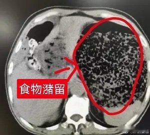 他十二指肠那里有术后梗阻,自己饮食方面,没有遵循少吃多餐,造成大量食糜潴留在胃腔。