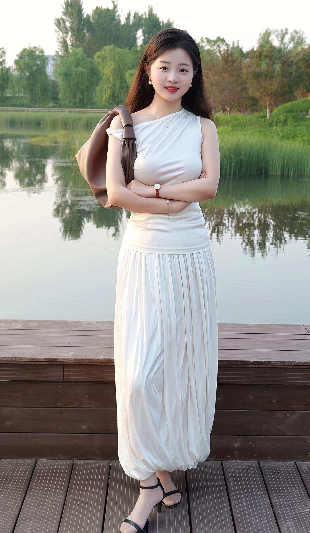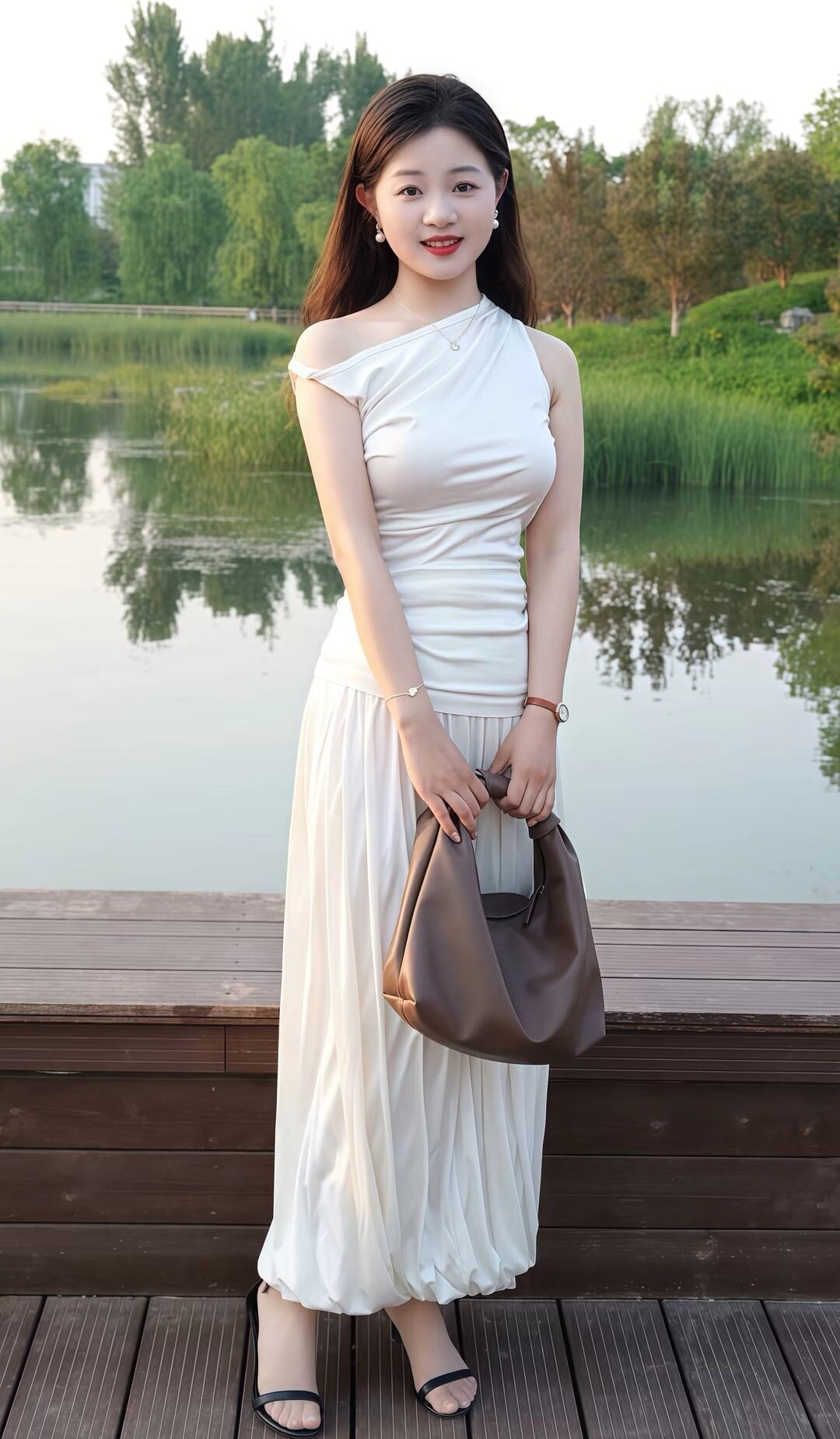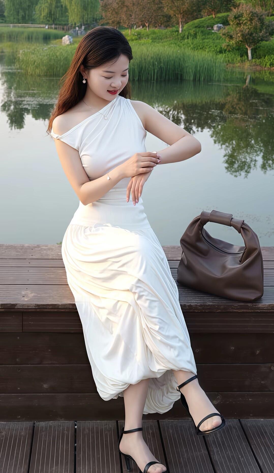 湖畔白裙美人,静坐思悠然。