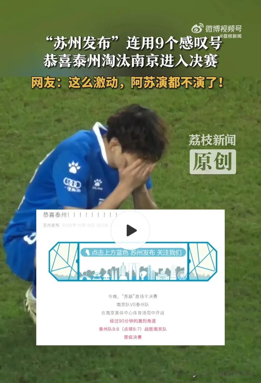 笑死了,“南哥”点球输了无缘决赛,直接捂着脸就蹲下了[捂脸] 而其他太保还是没放过“南哥” 苏州:连发9个感叹号 恭喜泰州淘汰南京进入决赛 常州:我平了泰州,他赢了南哥不就等于我赢了南哥[祝福] 其他太保:庆祝南哥输球...来来来,干一个[啤酒] 看来你们苏超太保都是反骨,是真不给省会城市脸啊,还要往上踩几脚[笑哭][笑哭][笑哭] 不过我喜欢[大笑],加油加油加油[啤酒][啤酒][啤酒],足球有你们就有未来,都是好样的[送自己一朵花][送自己一朵花][送自己一朵花]
