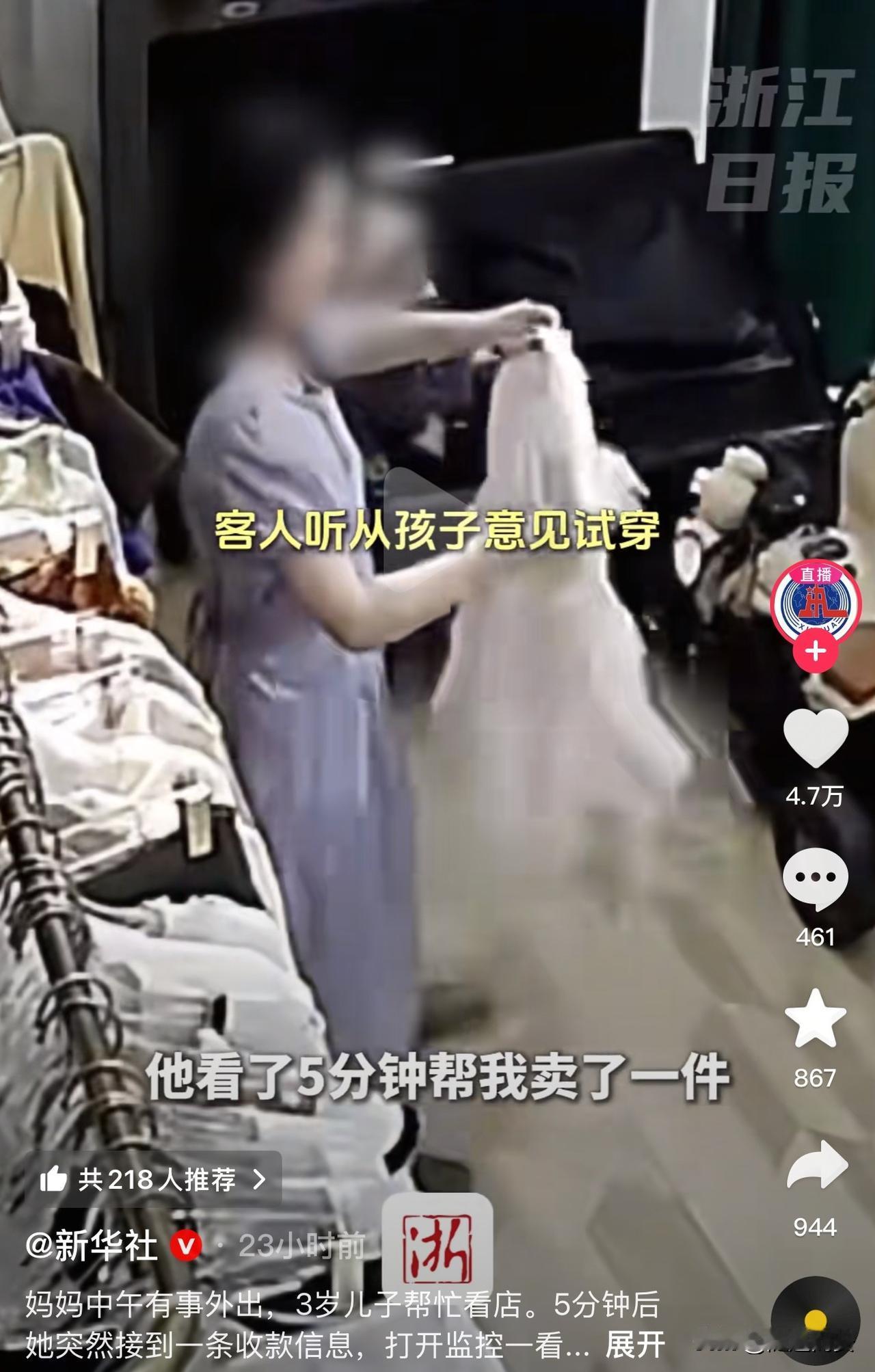 这小家伙火到新华社了!浙江宁波的一位服装店老板,临时有事外出,让3岁的儿子帮忙看店,刚出门5分钟她就接到收款信息,令人没想到的是,小家伙一下子卖出去11件衣服。 服装店老板接到收款信息感觉很诧异,她打开监控回放,发现她儿子正在帮她卖衣服。 只见视频里一位女顾客上门,拿起一件衣服试了试,询问小家伙“阿姨,穿这件衣服好看吗?” 小家伙看了看,并没有像其他销售那样昧着良心说“穿啥都好看”,而是真诚给顾客推荐其他款式的衣服。 这个小家伙看到有顾客买衣服一点也不怵头,反而大大方方的让顾客挑选并且试衣。 他的情商也很高,在面对不合适顾客的衣服时,他没有违心的说“阿姨穿啥都好看”,而是用自己的审美来推荐合适的衣服。 有网友称,她也很喜欢孩子的这种销售方式,没有玩命的推销,也没有说好听的,换衣服又很轻松,孩子又会给出很真实真诚的建议,自己一点也不社死,孩子又肯理她,真是完美。 也有网友说,其实是没有大人在场的购物环境让人分外放松。 确实,大人的销售模式就是不管你合不合适,只要我能卖出货就可以,不管你试的衣服在难看,他们也嘴甜的说“美女,你穿这件太合适了,你看多显瘦”。 其实,我们买衣服不是反感他们推销,而是步步紧逼你“必须买”的功力感,孩子的真诚,反而是消费者最舒服最自在的状态。