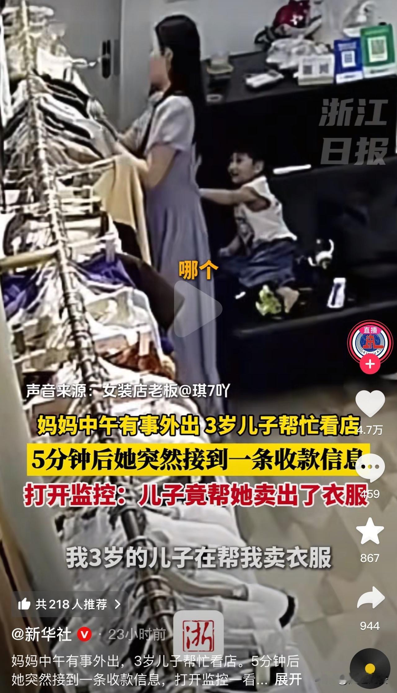 这小家伙火到新华社了!浙江宁波的一位服装店老板,临时有事外出,让3岁的儿子帮忙看