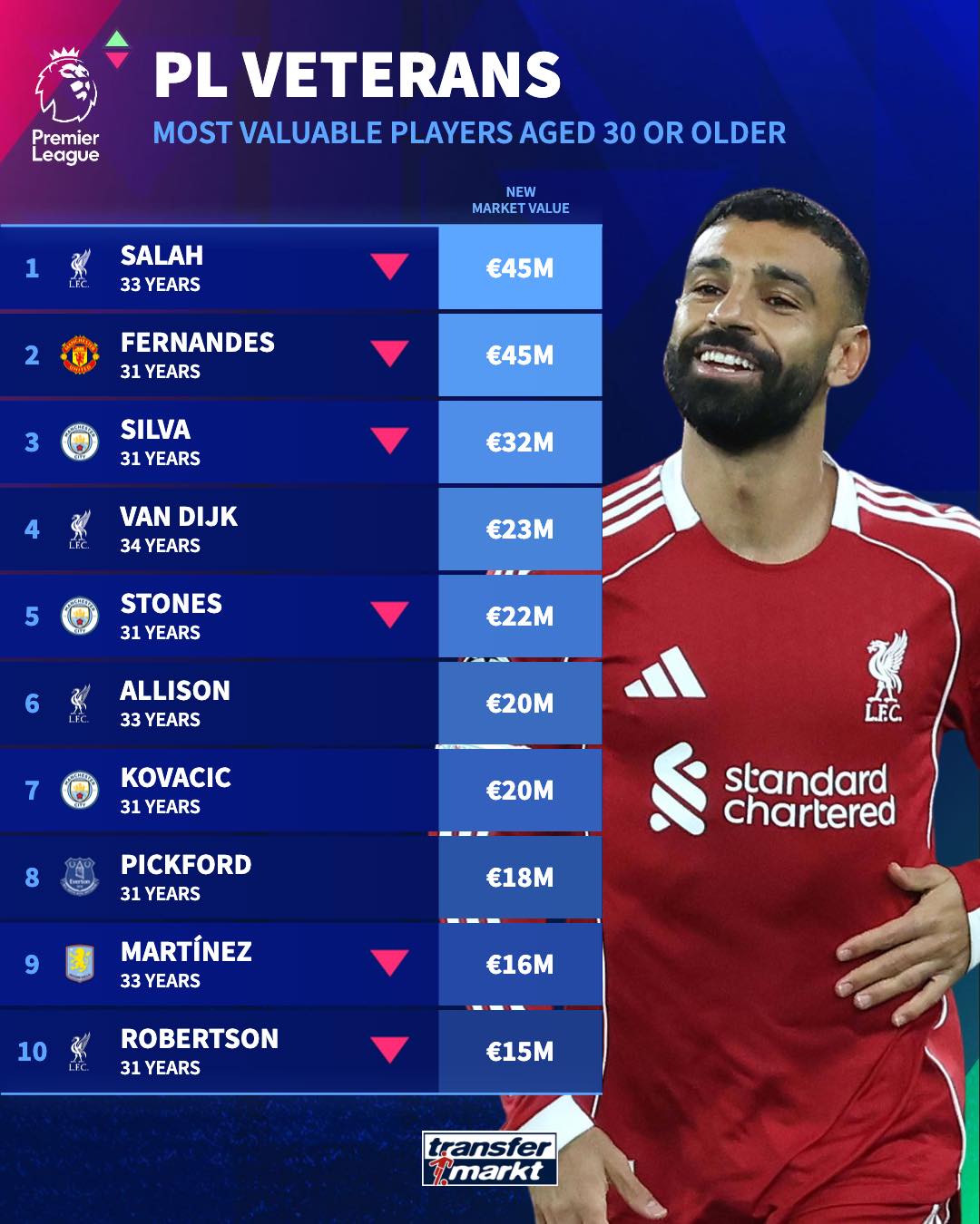 30岁以上球员身价榜: