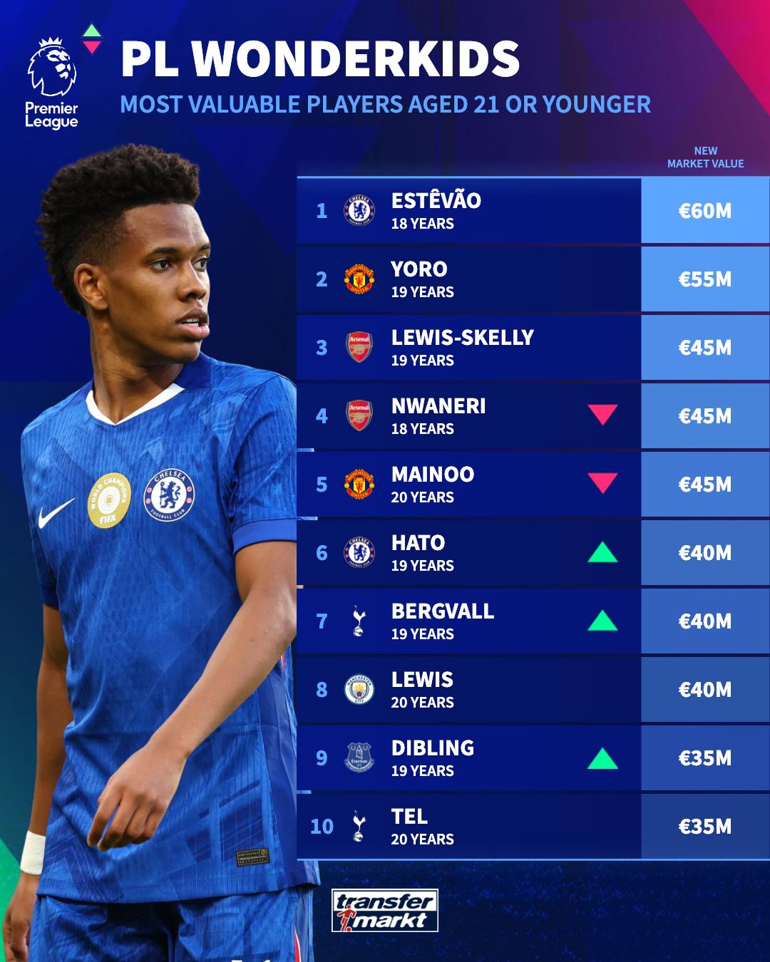21岁以下球员身价榜: