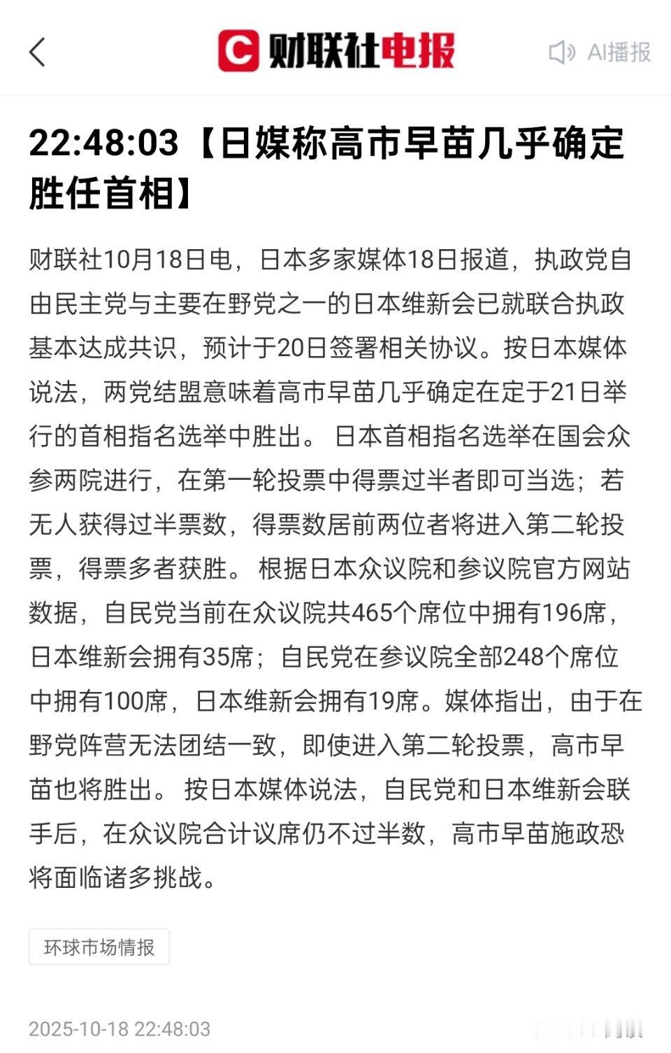 高市早苗首相稳了🔻日本维新会背信弃义。日本自民党与日本维新会宣布联合执政,高市早苗预计可以获得231票,遥遥领先。高市早苗几乎确定将胜任日本首相了。[哆啦A梦吃惊][哆啦A梦吃惊]