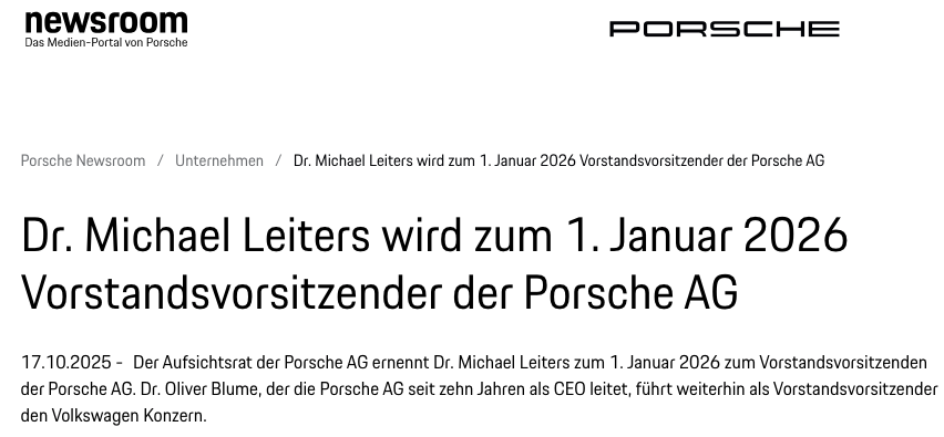 10月17日,德国豪华汽车制造商保时捷在官网宣布,监事会决定任命迈克尔·莱特斯(MichaelLeiters)为首席执行官(CEO),任命自2026年1月1日起生效。同时,保时捷表示,领导公司十年之久的首席执行官奥博穆·布鲁姆(OliverBlume)将继续担任大众汽车集团CEO。