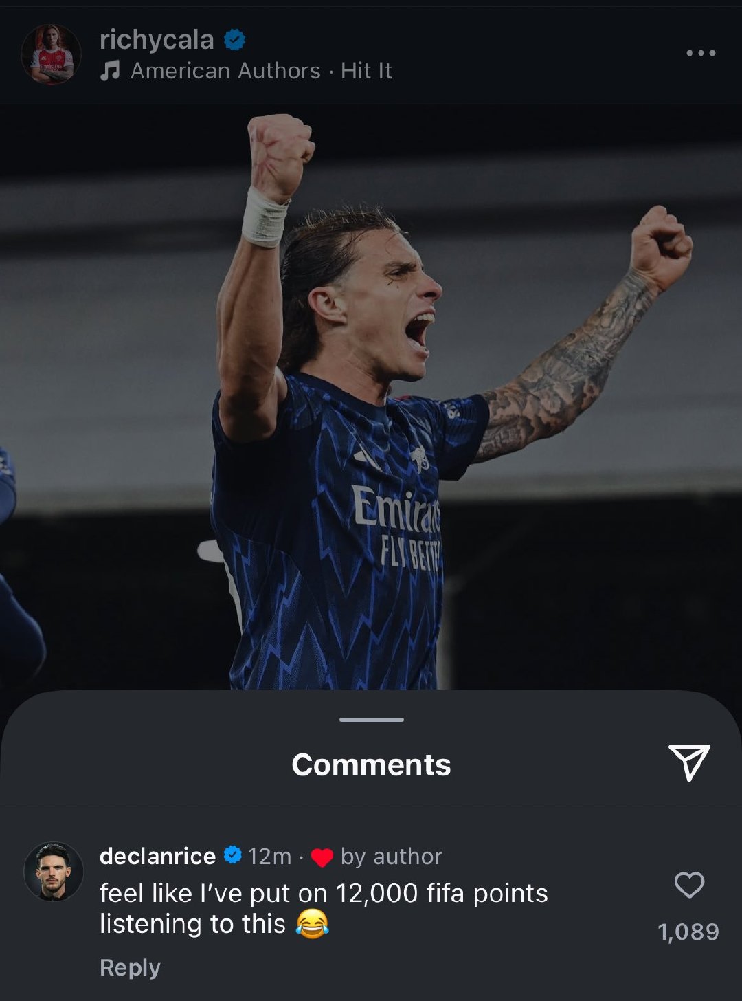 赖斯评论卡尔菲奥利选用《Hit It》——FIFA14原声带曲目作为Ins背景音乐: