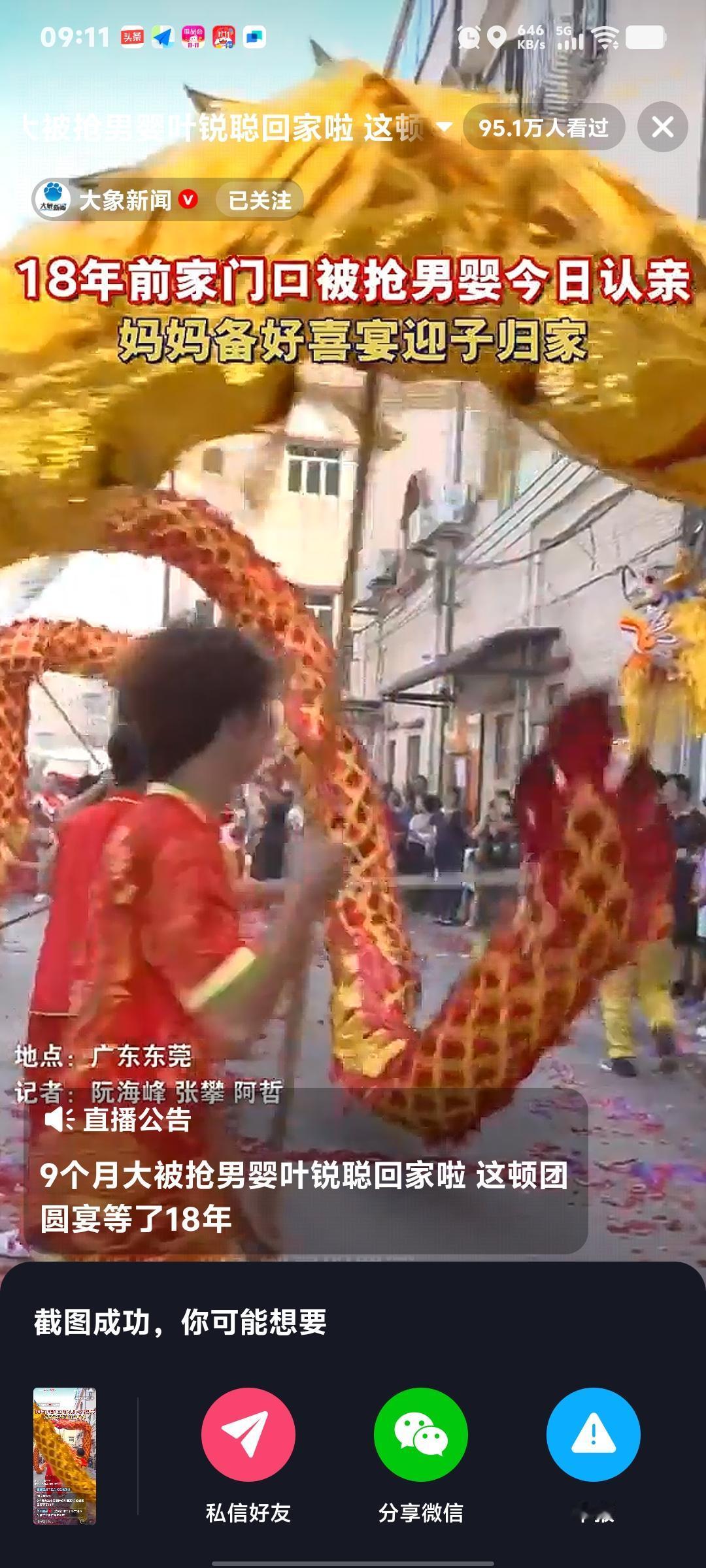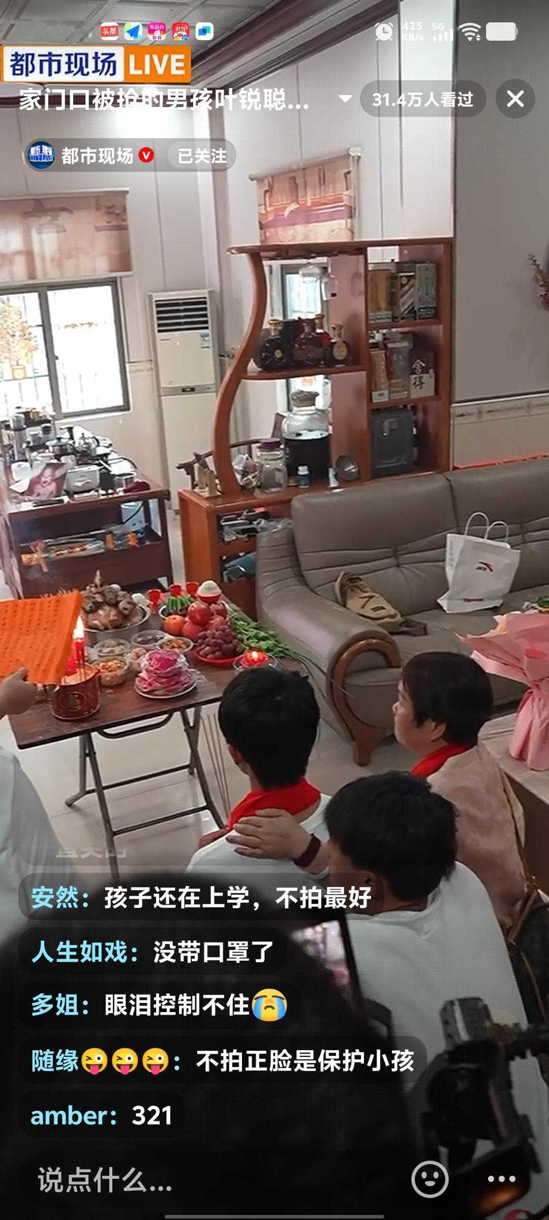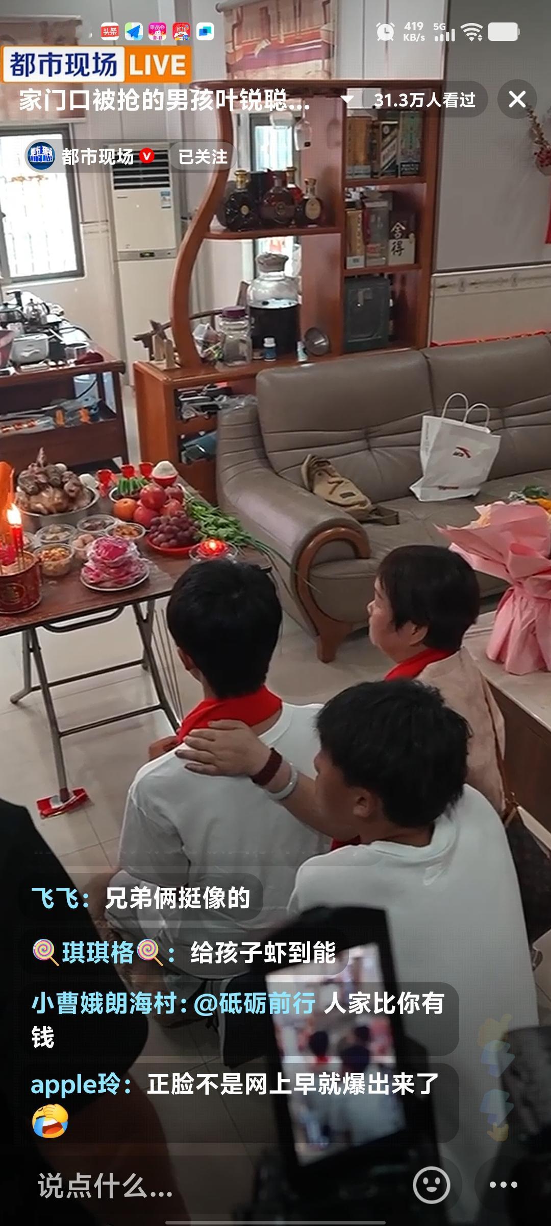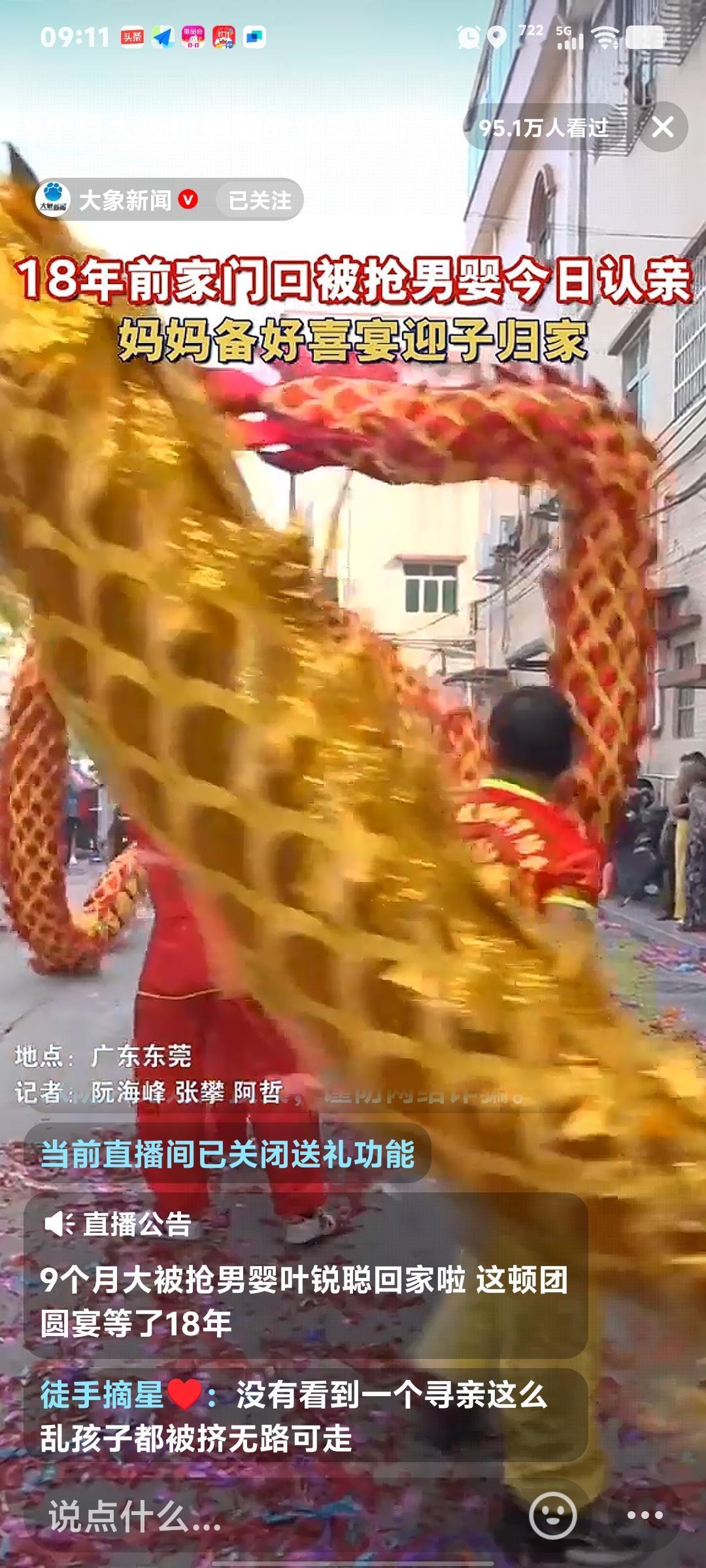 叶锐聪认祖归宗!全家跪地陪祭,广东长辈告慰先祖,18年寻亲路终团圆 叶锐聪跪在家中客厅的供桌前,旁边有爸爸妈妈,姐姐,弟弟陪着,全都跪在那里。 家族中的长辈用广东话告慰老祖宗,叶锐聪,离家18年终于找回来了。 虽然听不懂,但也能理解这段话的意思。 场面非常盛大,光鞭炮就放了半个小时, 外面还有锣鼓的声音,还有舞龙的队伍,寻亲家长们,再加上亲友们,估计现场得有上千人。 现场热闹又感人,从此一家人也算是团圆了,祝福他们。