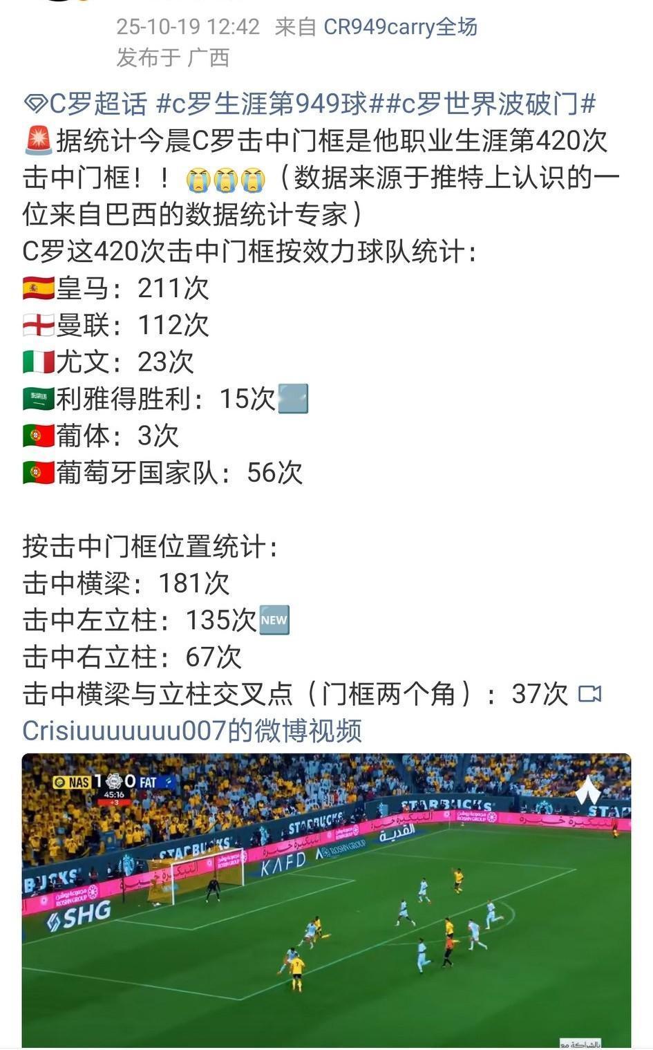 这种数据居然也有人统计,C罗这420次击中门框次数: 按效力球队统计。 按击中门框位置统计。