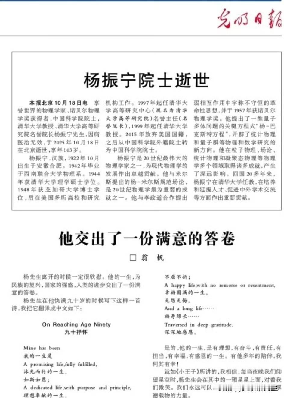 看了翁帆在光明日报发表的悼念文章 她笔下的杨先生离开时很欣慰,一生为民族复兴和国家强盛交出了满意答卷。 文章里附了杨振宁九十岁写的一首诗,翁帆亲自翻译成中文。诗里说,他的一生是沐光而行的,如斯如愿;是理想奉献的,不屈不折;是幸福圆满的,无怨无悔。二十多年的陪伴,翁帆只用了一句何其有幸。 她提到小王子的故事,相信杨先生会在星空中微笑。他们的感情从一开始就不被多数人理解。1995年相识时翁帆还是学生,负责接待杨振宁和杜致礼夫妇。2003年杜致礼去世,两人重逢后通信变多。2004年结婚,82岁的他和28岁的她面对无数质疑。 杨振宁曾说翁帆是上帝给他的最后一份礼物。翁帆则觉得,这段婚姻让她进入了一个纯净的世界。杨振宁清醒地意识到年龄差距,说过将来自己不在了,翁帆还可以再结婚。 现在再看翁帆的文字,平静底下是深深的懂得。她说从他那里能找到自强不息的力量。感情的真实样子,从来不在别人的眼光里。