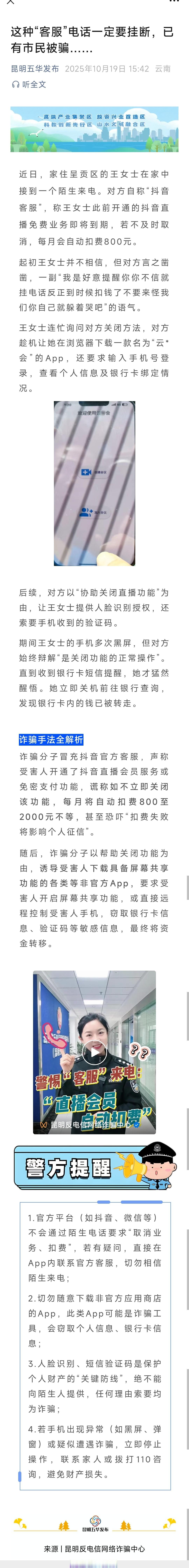 【这种“客服”电话一定要挂断,已有市民被骗】近日,家住呈贡区的王女士在家中接到一个陌生来电。对方自称“抖音客服”,称王女士此前开通的抖音直播免费业务即将到期,若不及时取消,每月会自动扣费800元。
