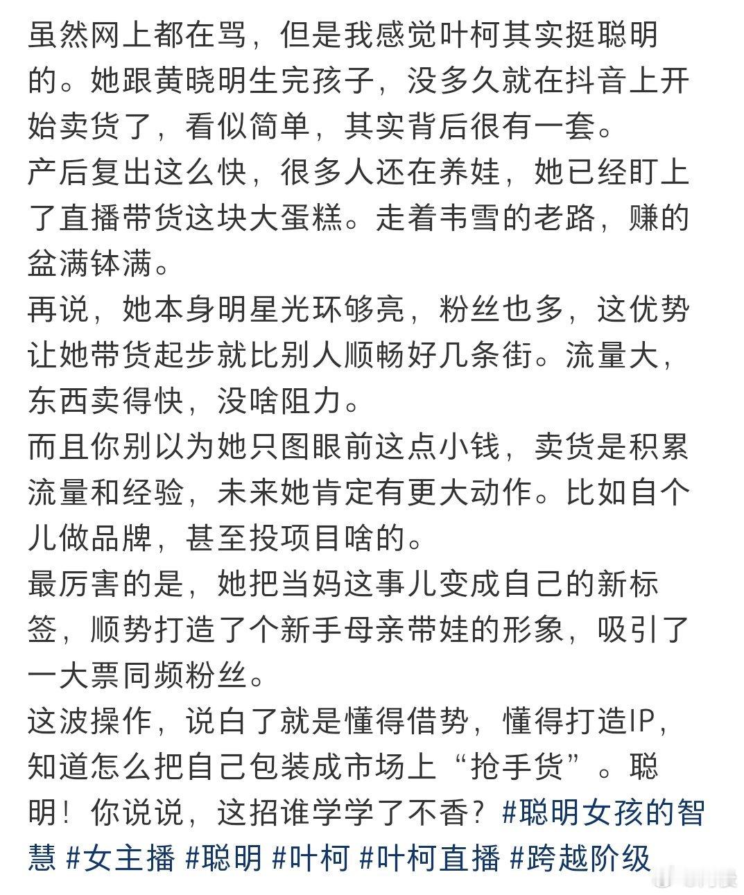 是不是do的太多太僵硬了,但是没人觉得叶柯真的很聪明嘛,每次出现都有话题热度,互联网这碗饭她是真的吃上了
