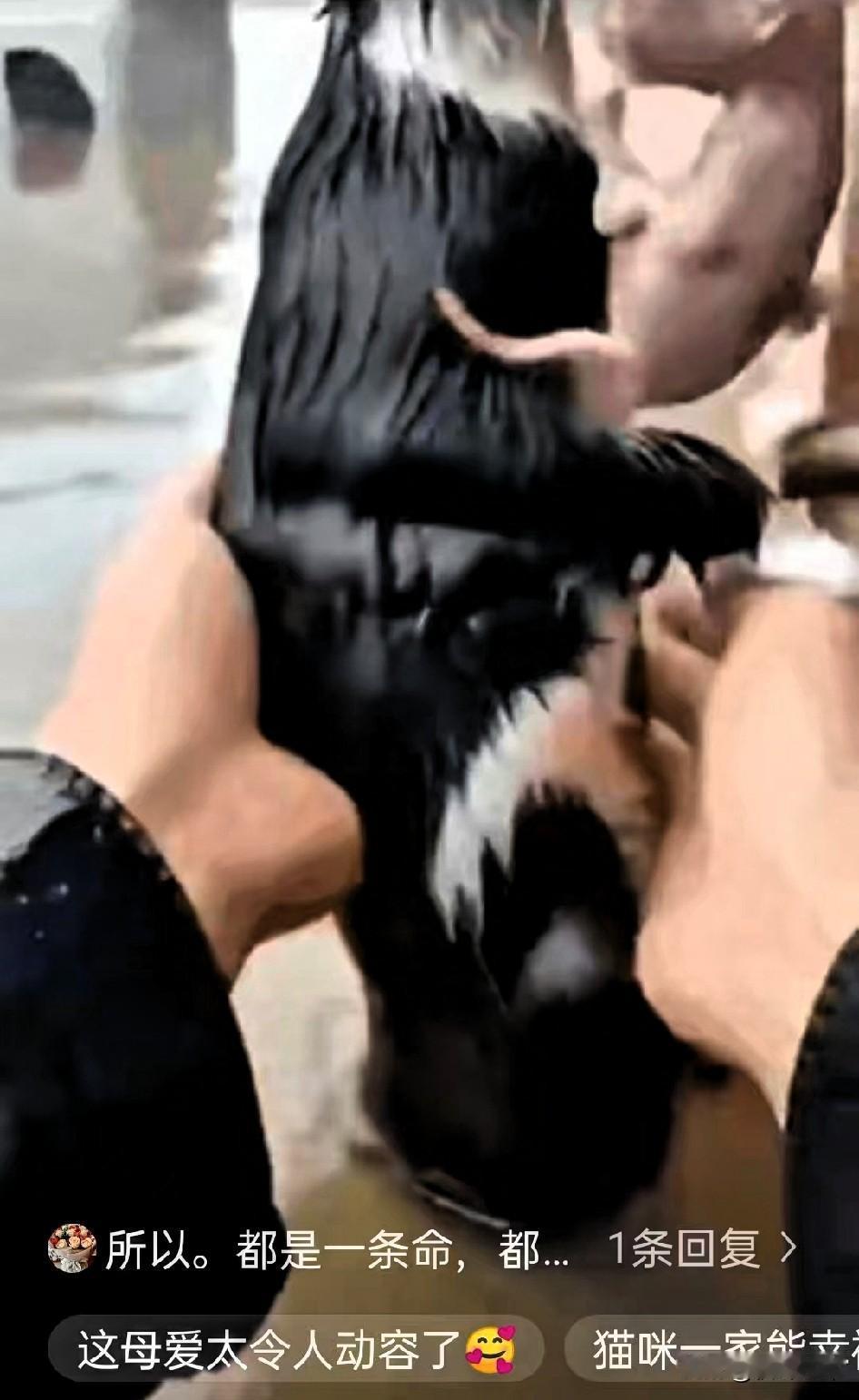 泪目了,这就是母爱,洪水中,一只流浪猫妈妈两只爪子死死抓住一个门把手 指缝都因为用力而泛白,嘴里紧紧叼着刚出生的猫宝宝,小奶猫被护得严严实实,连一丝水渍都没沾到。 它浑身的毛被洪水泡得贴在身上,瘦弱的身子在风里不停发抖,明明自己都快撑不住了,爪子开始打滑,却始终没松过口。那双眼睛里没有恐惧,只有“一定要护着孩子”的坚定,仿佛在说:就算拼了命,也不能让宝宝出事! 就在这千钧一发的时刻,一艘救援艇开了过来。艇上的大哥一眼就发现了这对母子,他放慢速度,小心翼翼地伸出手,生怕惊扰到猫妈妈。 让人暖心的是,平时对人充满警惕的猫妈妈,像是看穿了大哥的善意,居然乖乖配合,任由他把自己和宝宝抱上救援艇,全程都把小奶猫护在怀里,半点不敢放松。 后来大哥干脆收养了它们,视频里,猫妈妈终于能在干燥温暖的窝里喂奶,小奶猫缩在妈妈身边小声哼唧,画面治愈又戳心。其实哪有什么“物种之别”?母爱从来都是刻在骨子里的本能——无论是人还是小动物,为了孩子,都能爆发出对抗绝境的勇气。 那些说“动物不懂感情”的人,怕是没见过这样的场景。这只猫妈妈的守护,比很多刻意煽情的故事更有力量。你有没有见过小动物身上,那些让你瞬间破防的亲情瞬间?
