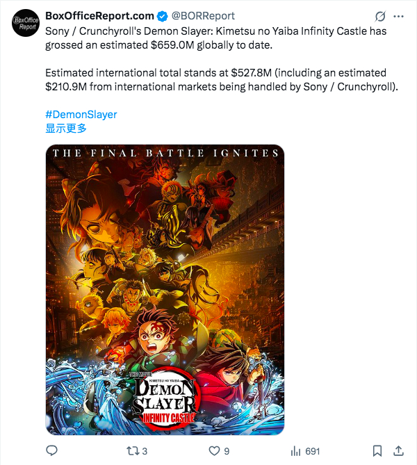 TNABO 《鬼灭之刃 剧场版 无限城篇 第一章 猗窝座再来》全球票房截至周日结束累计6.59亿美元,位列今年第五,继续拔高R级动画票房纪录。
