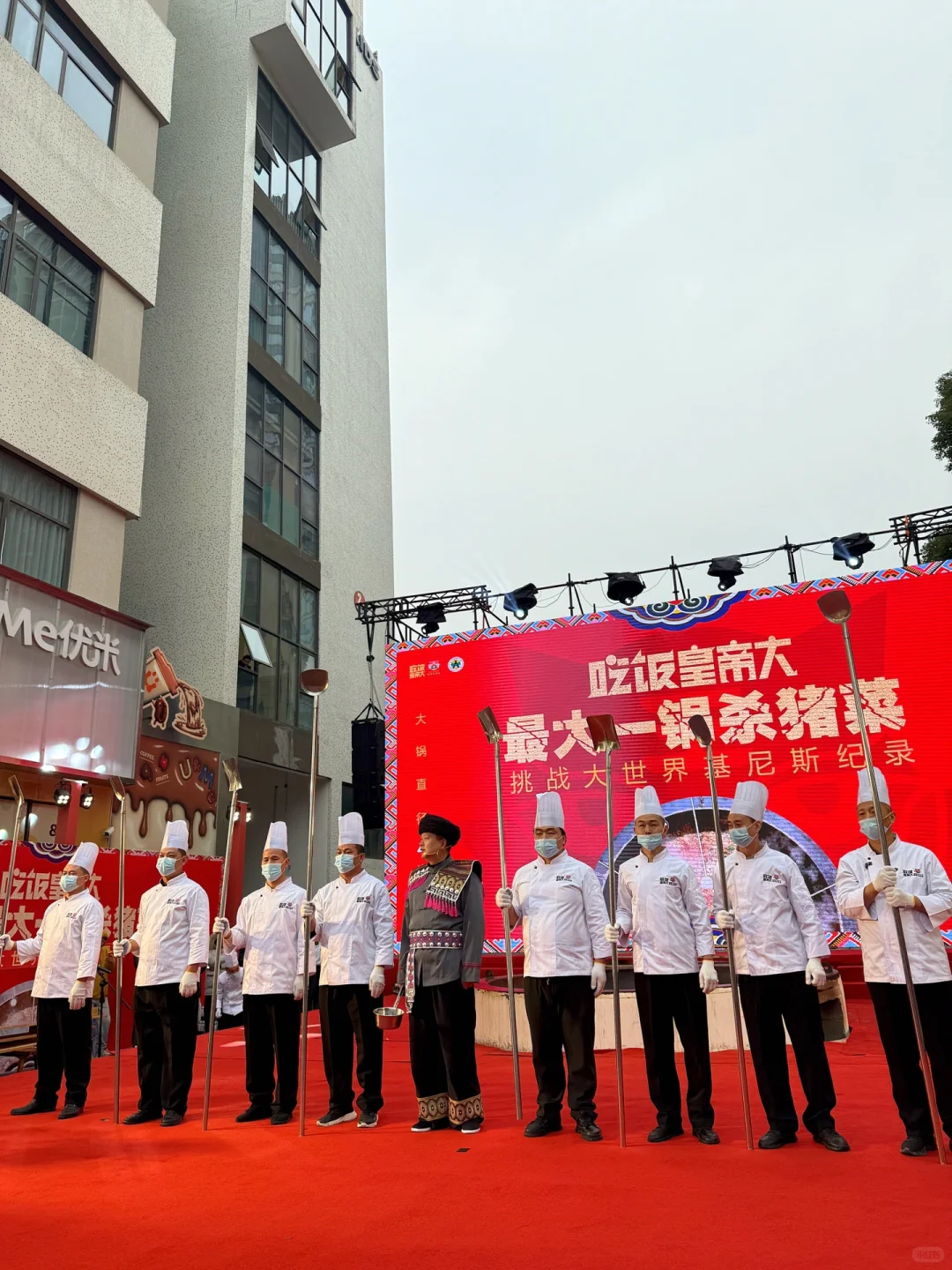 又又又见证了历史了啊啊啊!!成功挑战世界上zui大一锅杀猪菜!! 吃饭皇帝大的2024年第六届年猪节太有意义了! 现场是大兵老师主持的,特别热闹!!! 18位大厨围着4米大锅,齐心协力花费一个多小时做出了两吨杀猪菜!现场人声鼎沸,炒的时候🔥把香气都把现场的朋友们馋到不行!! 最后来现场的姐妹全部都品尝到了,真的仿佛回到小时候过年的感觉!!不愧是咱们大湖南的品牌,办起活动来就啊大气就是👍🏻!!