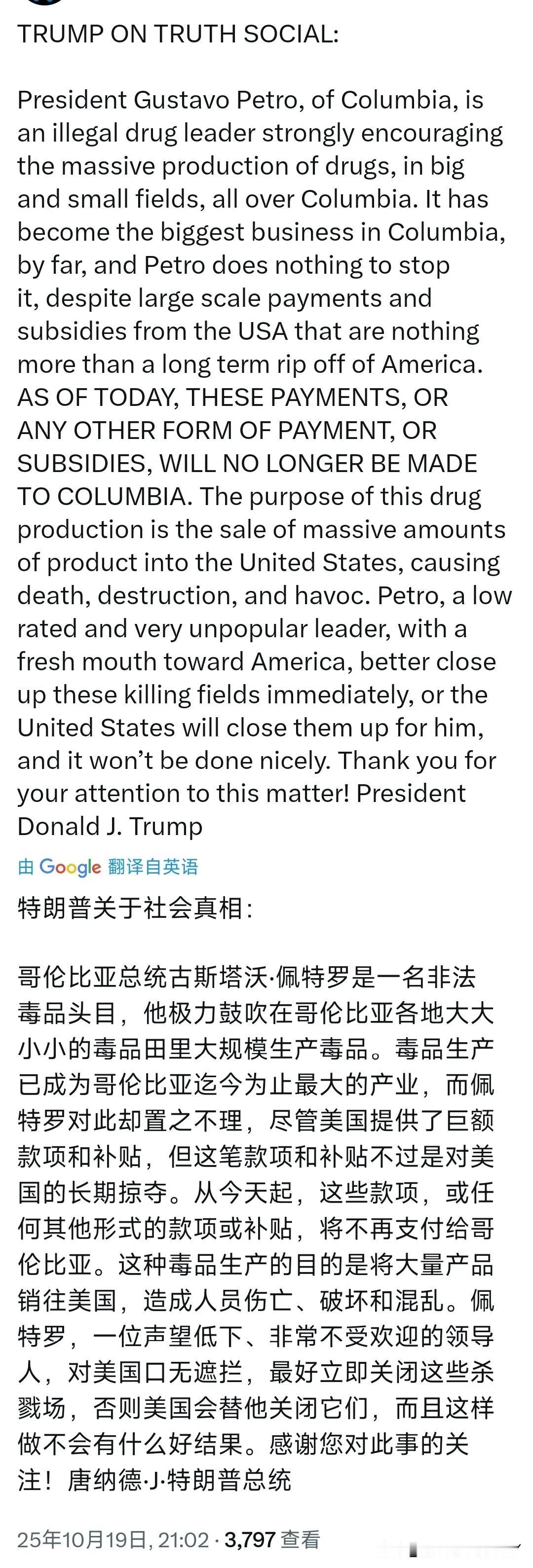 特朗普指控这个挺委内瑞拉的国家总统是非法毒品头目。 美国总统特朗普10月19日晚发文写道:“哥伦比亚总统古斯塔沃·佩特罗是一名非法毒品头目,他极力鼓吹在哥伦比亚各地大大小小的毒品田里大规模生产毒品。 特朗普抹黑哥伦比亚总统:霸权逻辑下的荒唐闹剧 特朗普这番言论字里行间满是蛮横与偏见,既无事实支撑,也无逻辑可言。特朗普在文中言之凿凿,声称毒品生产已是哥伦比亚“迄今为止最大的产业”,还抱怨美国提供的“巨额款项和补贴”成了对美国的“长期掠夺”。 可稍微了解哥伦比亚的人都该反问,一个主权国家的核心产业,难道会是危害全球的毒品?这种说法本身就站不住脚。事实上,佩特罗政府一直在反毒领域付出实实在在的努力。 2024年上半年,哥伦比亚缉获的可卡因数量同比增加35%,半年内就收缴了近400吨可卡因、260多吨大麻,还摧毁了2000多个制毒工厂,铲除了200多万棵用于制造毒品的古柯树。 这些实打实的数据,就是对特朗普“置之不理”论调最直接的反驳,所谓“毒品头目”的指控,不过是毫无根据的恶意揣测。再看哥伦比亚真正的产业格局,特朗普的说法更是错得离谱。 这个国家是全球知名的咖啡和香蕉生产国,我们日常喝到的不少优质咖啡,其原料就来自哥伦比亚的优质产区,咖啡产业不仅支撑着数十万家庭的生计,还为全球市场提供着稳定的供给。 矿业更是哥伦比亚的经济支柱,煤炭产量在拉美地区位居前列,单是煤炭出口就占了矿业总出口的65%;黄金储量排在拉美第三,2024年的黄金产量达到7吨;更值得一提的是,哥伦比亚还是世界上最大的绿宝石生产国,每年产出的绿宝石以其纯净度和色泽闻名全球。 这些合法产业不仅带动了哥伦比亚的经济发展,还为国际市场贡献着价值,特朗普却视而不见,硬把“最大产业”的帽子扣在毒品上,要么是对哥伦比亚的经济状况一无所知,要么就是故意用谎言混淆视听。 那么,特朗普为何要如此气急败坏地针对佩特罗?真正的原因,藏在佩特罗的外交立场里。佩特罗就任哥伦比亚总统后,始终坚持独立自主的外交政策,不愿跟着美国的指挥棒走,尤其在委内瑞拉问题上,他没有盲从美国的对抗姿态,反而主张与委内瑞拉发展正常的国家关系,这种“不站队”的态度,恰好戳中了美国的敏感神经。 长期以来,美国都把拉美地区视作自家“后院”,从历史上的“门罗主义”到如今的各种干预手段,从未放弃过对这片土地的操控。佩特罗不愿做美国的“傀儡”,坚持按本国利益制定外交策略,这种“不听话”的表现,自然成了特朗普眼中的“眼中钉”,所谓的“毒品指控”,不过是用来打压异己的借口。 熟悉美国对外策略的人都清楚,以“反毒”为名干涉他国内政,早已是美国的惯用手段。早年间美国推出的“哥伦比亚计划”,表面上是提供援助帮助哥伦比亚打击贩毒,实则是借此机会向哥伦比亚渗透军事力量、捆绑外交政策,多年来提供的数十亿美元援助中,大部分都流向了美国的军事机构和合作企业,真正用于哥伦比亚民生改善、帮助农民转型种植的资金少得可怜。 特朗普威胁要切断的“款项和补贴”,本质上就是美国操控他国的“诱饵”。美国向来喜欢用经济援助当筹码,一旦对方不顺从自己的意愿,就立刻收回“好处”,摆出威胁的姿态。这种“给糖就听话,不给糖就翻脸”的套路,在拉美地区早已被看穿。 从过去干涉巴拿马运河主权,到随意给古巴贴上“支恐国家”标签,再到试图操控墨西哥的移民政策,美国的每一次“援助”背后,都藏着掠夺资源、操控政权的野心。如今对哥伦比亚故技重施,不过是想通过经济胁迫,逼佩特罗政府放弃独立自主的外交路线,乖乖成为美国的“附庸”。 更荒唐的是,特朗普还在文中倒打一耙,声称美国的援助是被“掠夺”。可事实上,美国提供的所谓“援助”从来都不是无偿的善意。通过这些资金,美国不仅要求哥伦比亚在外交上紧跟自己的步伐,还借机掌控了哥伦比亚的部分经济资源,甚至以“缉毒”为名在哥伦比亚境内开展军事行动,多次造成无辜平民伤亡。 特朗普还在文中贬低佩特罗“声望低下、非常不受欢迎”,可这不过是他的主观臆断。一个坚持维护国家主权、为民众谋福利的领导人,怎么可能得不到民众的支持? 佩特罗政府推动的农民转型计划,帮助那些原本种植古柯的农民改种咖啡、可可等合法作物,既从根源上打击毒品生产,又改善了农民的生活,这样的政策深受哥伦比亚民众认可。 如今的拉美地区,早已不是美国可以随意摆布的“后院”。从墨西哥到巴西,从古巴到委内瑞拉,越来越多的国家开始觉醒,拒绝再屈从于美国的霸权,坚持走符合本国利益的发展道路。 特朗普这场抹黑闹剧,最终只会让美国自食恶果。肆意污蔑他国领导人、践踏国家主权、动辄挥舞经济制裁大棒,这样的行为只会让美国在国际社会上越来越孤立,所谓的“道义威望”也会在一次次的霸权行径中消耗殆尽。