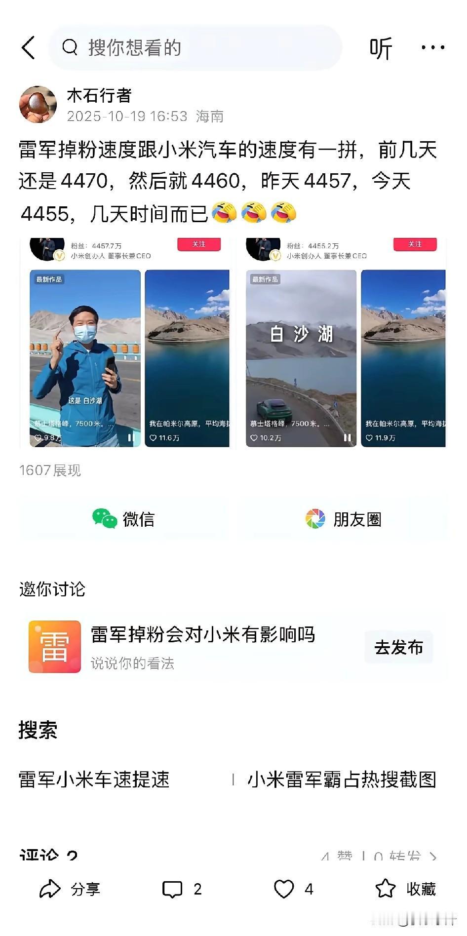 雷军这掉粉速度,简直和小米汽车飙起来有的一拼!前几天我特意留意了下,还稳稳停在4463万,没两天就掉到4460万,昨天再看又少了3万成4457万,今天一早直接到4455万。更离谱的是,一小时前我发动态时还是4455万,就隔这么会儿功夫,再刷新已经是4454.8万了,掉粉跟按了快进键似的。 其实雷军和小米一直有热度,但短时间内粉丝稳步下滑,或许和大家对小米新品的期待落差有关,毕竟关注度高,大家的要求也更严格了。