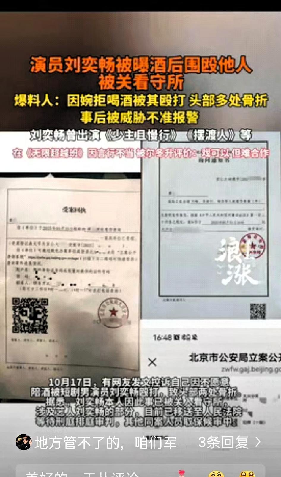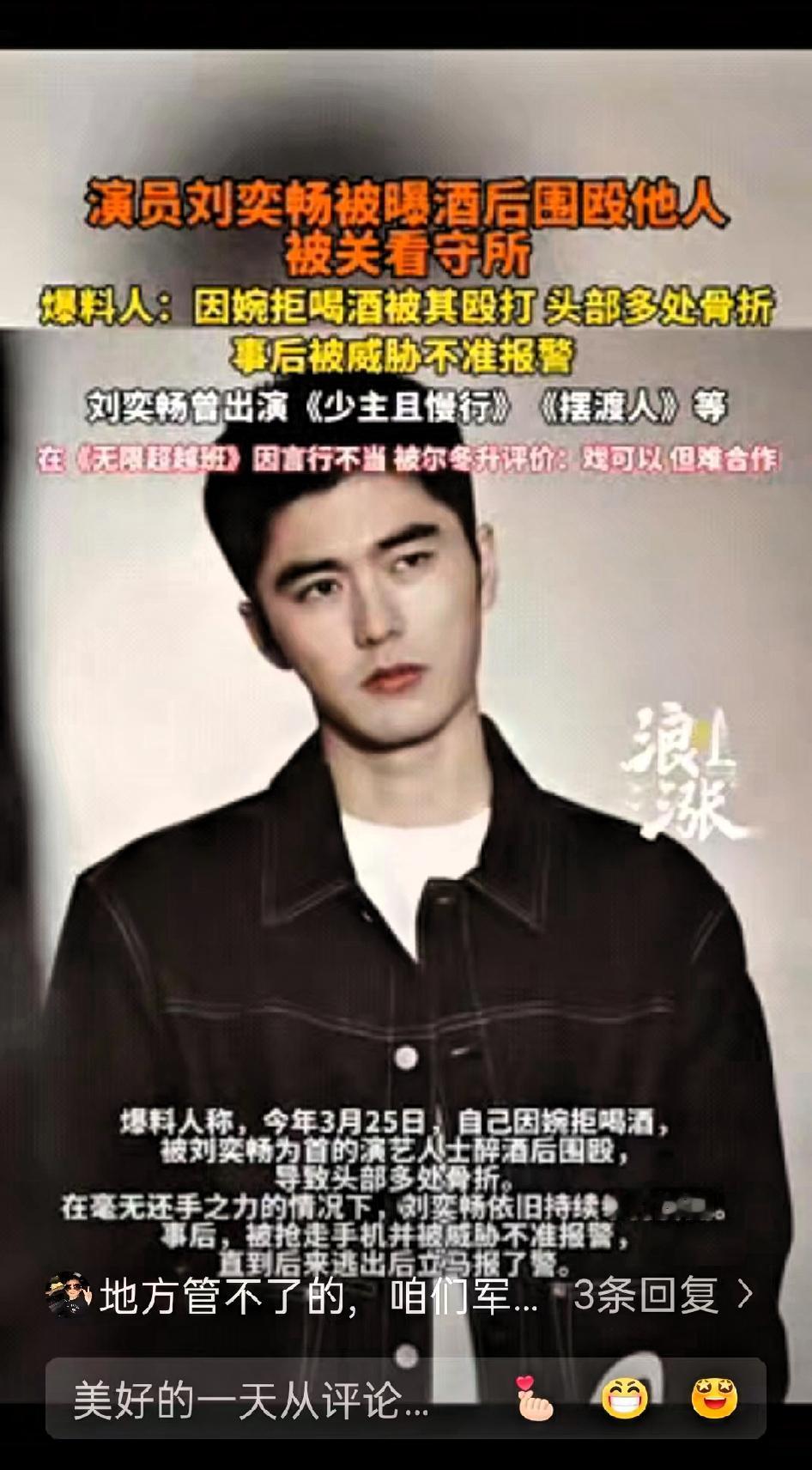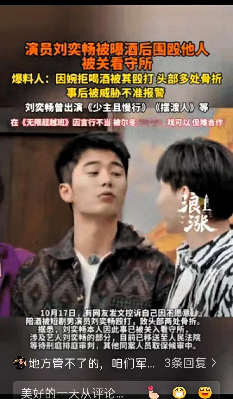 明星众人殴打现役军人 事后进派出所竟然集体串供 28岁演员刘奕畅的行为,已经突破了公众人物的底线,更触碰了法律的红线。现役军人婉拒陪酒,竟遭他带人围殴,用洋酒瓶砸头、碎瓶试图捅刺,导致军人头部两处骨折,险些窒息,这种暴力行为绝非公众人物应有的表现。 事后他的操作更显无知与嚣张:抢手机威胁受害者不准报警,随即建群串供,编造“互殴”“情感纠纷”的谎言,女友也协助销毁证据,全程没有丝毫悔意,满脑子都是逃避责任。更让人不适的是,施暴后他仍正常参与综艺,谈论“德艺双馨”,还在八一建军节发文致敬军人,言行不一的反差令人反感。 这不是简单的“艺德问题”,而是明确的违法犯罪。军人肩负守护家国的职责,理应得到尊重,绝不能被随意侵害。他显然没意识到法律的严肃性,也无视军人的神圣职责,误以为名气能成为挡箭牌。如今他被关押等待审判,代言解约、新剧下架,都是违法失德的必然结果。 公众人物更应坚守法律底线、尊重他人,尤其是守护我们的军人。这种既违法又失德的艺人,显然不符合公众期待。