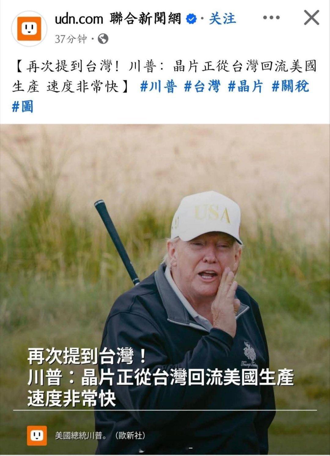 特朗普:芯片正从台湾地区回流美国生产,速度非常快!
