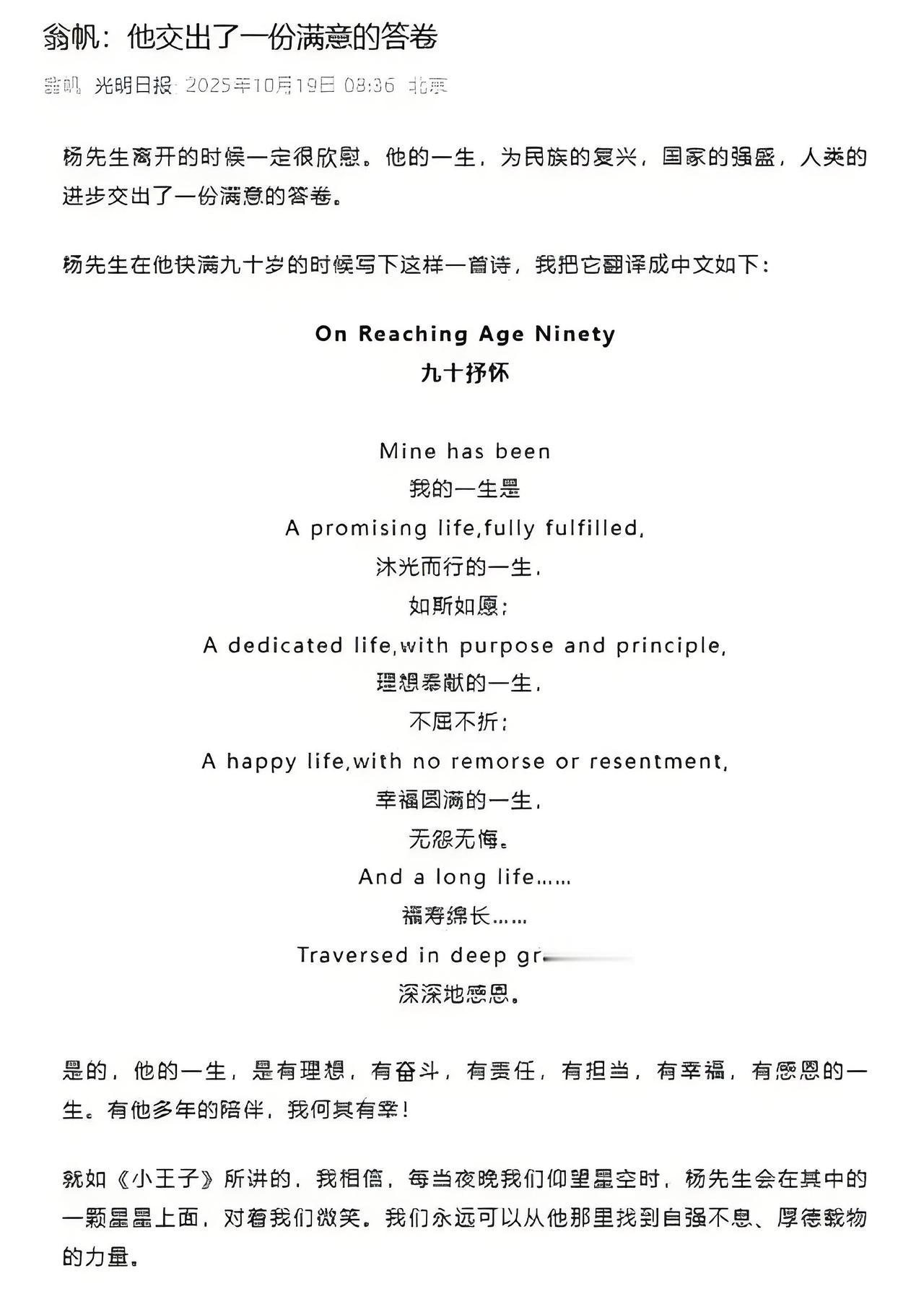 当杨夫人翁帆在《光明日报》写下“有他多年的陪伴,我何其有幸”时,那些跨越二十余年的时光碎片,瞬间在墨色里有了温度。这份始于仰望的情感,从未因岁月流转而褪色,反而在生死相隔的时刻,愈发清晰地显露出原本的模样。 1999年汕头大学的初见,翁帆还是那个带着稚气的向导,而杨振宁已是享誉世界的物理学巨擘。彼时她眼中的惊叹,或许早已埋下了仰望的种子。多年后重逢相知,他与她携手走进婚姻,外界的喧嚣从未真正惊扰这份情感的内核——正如翁帆后来所说,是杨振宁塑造了现在的她,给了她一个纯净的世界。这份“纯净”,恰是崇拜最本真的底色,让她得以透过世俗的滤镜,看见他灵魂深处的光芒。 清华园的“归根居”里,那些平静的朝夕藏着最生动的注脚。她会静静坐在一旁,听他谈及物理世界的星辰运转,看他在纸上写下复杂的公式,或是陪他翻看早年与爱因斯坦的合影。对翁帆而言,杨振宁不仅是伴侣,更是一本厚重的书,是指引她认知世界的光。他曾说她是“上帝给我的最后一份礼物”,而她回馈的,是二十余年如一日的倾听与陪伴,是将这份仰望融入日常的温柔坚守。 当生命的时钟停在103岁的刻度,翁帆在悼念文中写下的,不是悲戚的挽歌,而是对他一生的礼赞。她特意翻译了他九十岁时写下的《九十抒怀》,“沐光而行的一生,如斯如愿;理想奉献的一生,不屈不折”,每一句翻译都藏着她对他的深刻理解。那些“有理想,有奋斗,有责任,有担当”的评价,既是对逝者的盖棺定论,更是她二十余年仰望的初心印证。 文末那句“每当夜晚我们仰望星空时,杨先生会在其中的一颗星星上面,对着我们微笑”,道尽了这份情感的真谛。翁帆对杨振宁的爱,从来不是依附于朝夕的相守,而是始于仰望、归于信仰的永恒。如今,他化作星空中的一点光,而她的仰望,早已成为带着力量的传承,在岁月里永远明亮。