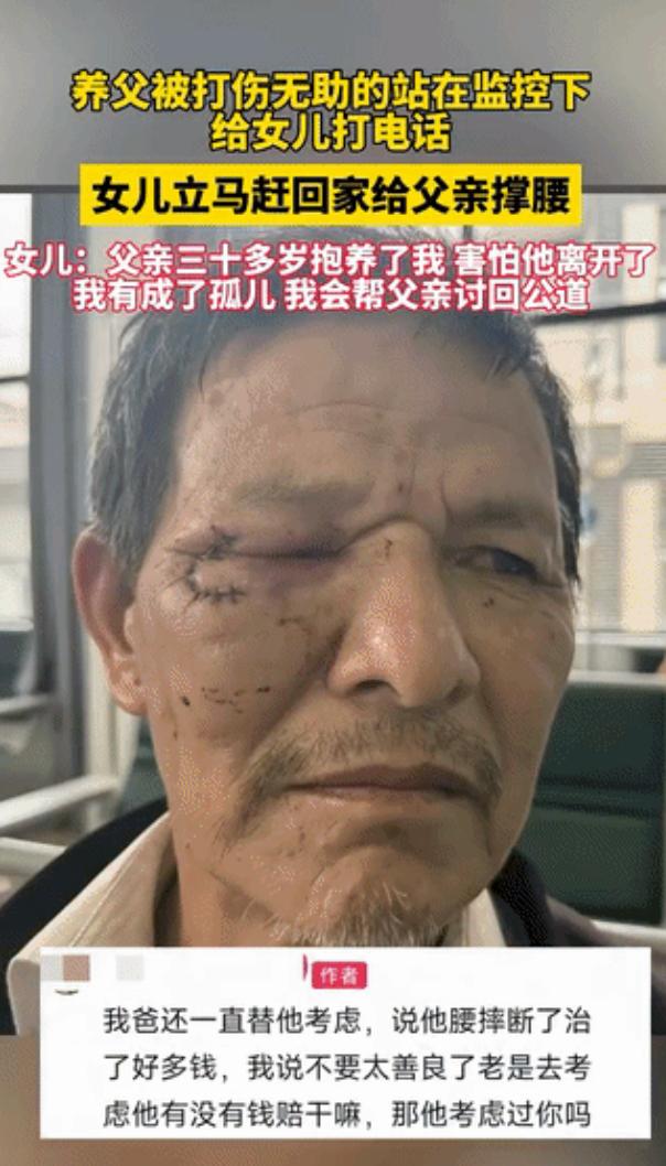 太欺负人了!10月14日,湖北,养父被三叔三婶打伤眼角,血染红了衣襟。他没有儿子撑腰,无助的站在监控给女儿打电话。女子接到电话后又生气又心疼,立马赶回去给养父撑腰! “啥生父养父,谁养大谁就是爹!” 近日,一则短视频让无数网友落泪。 镜头内,一个大叔满脸是血,他无助地望向墙角的摄像头,向女儿诉说“被打的遭遇”。 到底是什么人如此狠心,对一个孤寡老人下这么重的手? 可真相大白的时候又让无数人心寒,大叔竟然是被自己的亲弟弟给打了。都说兄弟手足,因为什么让亲弟弟对自己“大打出手”? 而大叔又是因为什么事情惹恼了疯狂的一家人呢? 心疼大叔的女儿再也不顾其他,给老板请假离开后,迅速踏上了回家的路。 一见到父亲,她就赶紧带他去医院检查,就连处理伤口的医生都觉得不可思议:到底是有多大的仇恨,竟然下这么重的狠手? 被打的真相竟然是一件小事。 农忙时节,大叔的粮食就在自家的院子里晾晒,吸引了三叔家的鸡跑来觅食。大叔担心粮食被糟蹋,就吵吵了两句想把鸡赶走,谁知道,三叔和三婶闻声赶来。 人善被人欺,三叔三婶面对大哥,丝毫没有尊敬,反而两夫妻联合起来,将大叔给打了。 三婶更是个厉害的角色,拿着一块石头就直接朝大叔的脸上砸去。 到底是为什么让他们有恃无恐? 说到底,还是因为大叔悲惨的身世。 一直以来,大叔就是个老实巴交的,不会花言巧语也不会阿谀奉承,父母对他不大上心,连婚姻大事都不管不顾,可怜大叔三十多岁的年纪还没有娶妻生子。 同为一母兄弟,三叔却早早娶了媳妇。 大叔彻底断了婚姻还是因为他的善心,一次普通的外出,他发现路边有一个没人要的女孩子,就把她抱回了家里。 这样一来,原本就穷得叮当响的家庭更不会有女主人的光临。 大叔毫无怨言,一个人把女儿拉扯长大。 虽不是亲生但胜似亲生,在大叔无微不至的照顾下,女儿很有出息,毕业就找了一个好工作,只是离家远,大叔又不愿意离开家。 无奈,孝顺的女儿就在家里装上了摄像头,随时关心养父的生活。 摄像头也成了父女两人的沟通工具,有什么事,大叔就通过摄像头告诉她。 大叔被欺负已经不是第一次了。奶奶去世后不久,三叔三婶就擅自做主,把老人墓碑上刻着大叔和养女的名字给划掉了。 在他们看来,大叔没有结婚也没有生孩子,将来他所有的财产就是他们夫妻两个人的,对于这个外来养女,他们更不把她放在眼里,一个外人,又有什么资格和自己争! 忘记了兄弟亲情,在一次次的欺负中竟然觉得痛快,真不知心里是多么的黑暗! 现在女儿已经长大,她可以站出来为自己的养父撑腰,再也不会让他白白受欺负。 既然三叔三婶不顾兄弟亲情,她又有什么好顾虑的? 养父的伤,她要讨回公道! 有网友评论:都说不是一家人不进一家门,看来,这老三和他媳妇的确不是东西。 也有网友评论:姑娘,你好样的,支持你为养父讨回公道。 有视频为证,相信三叔三婶一定会受到法律的制裁! 信息来源: 金龄社会 2025-10-16