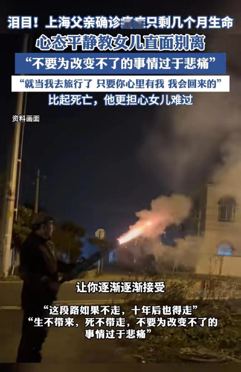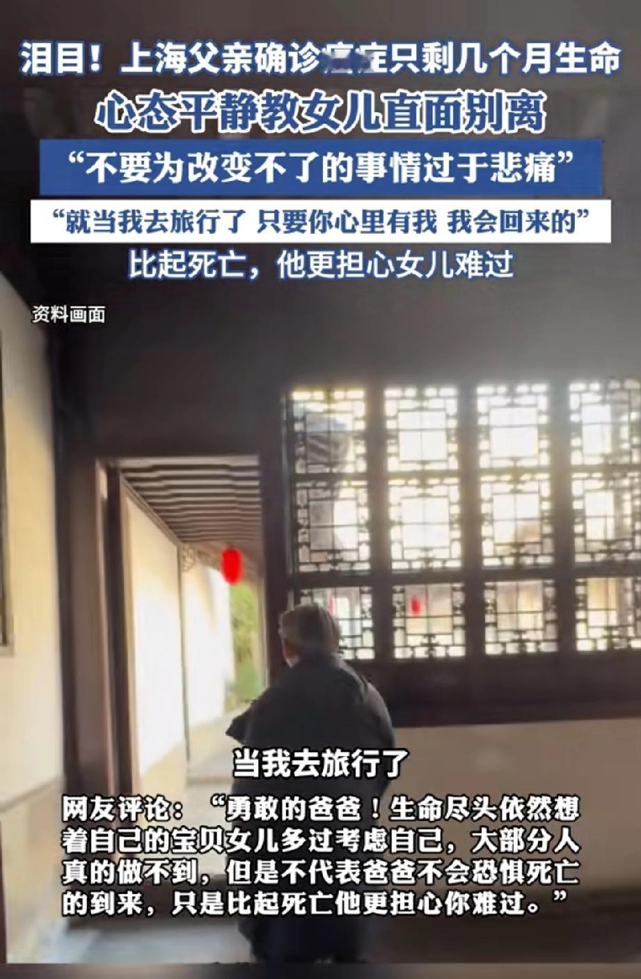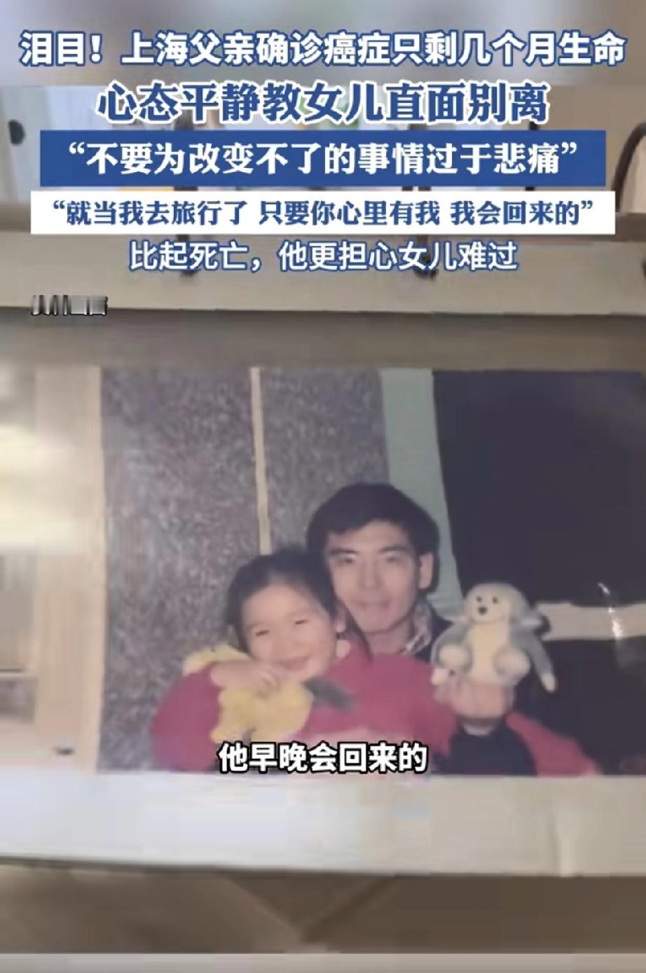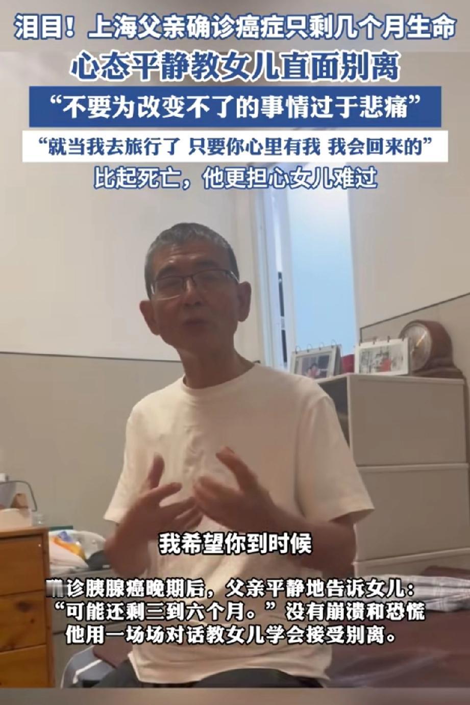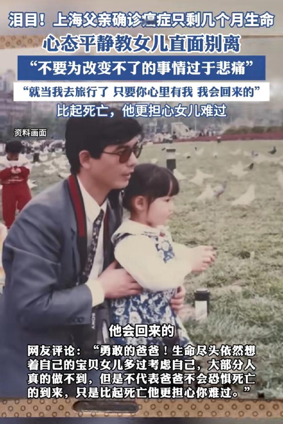 上海,父亲被查出患有胰腺癌。他平静地把病情告知家人,医生说他只剩下3到6个月的时间了。90后出生的女儿难以接受这残酷的现实,每日以泪洗面。 父亲安慰女儿:“孩子,别伤心,每个人都要经历这一遭,只是我比别人早了十几年。” 父亲说得轻松又坚强。 接着,他又对女儿说:“我提前跟你讲,就是想让你慢慢接受这件事。爸爸要走是自然规律,你就当我去旅游了。” 他还大声告诉女儿:“我会回来的,只要你心里有我,我早晚会回来。” 女儿把父亲安慰她的视频录下来并发布到了网上。 这是一位对生命有着深刻理解的父亲。 他明白生命是有轮回的,尽管看不见,却真实存在。 只要你善良且做过许多善事,“去去就来”是能够实现的。 然而,女儿依旧无法接受这个事实,她常常偷偷翻看幼年时和父亲的合照,回忆着父亲对自己的疼爱,心疼不已。 父亲还在身边,女儿每天在父亲面前强颜欢笑,带着他去实现那些曾经想做却没做的事,父亲也乐呵呵地和女儿一同游玩。 女儿舍不得父亲,这是人之常情。但每个生命终有离去的一天,若生命没有终结,新的生命继续诞生,地球将不堪重负,资源也会枯竭。 看看这世界,无论是植物,还是虫、鸟、鱼等动物,都有各自的寿命。它们的离去,是为了维持生态平衡,让世间永葆生机。 理解了生命的意义,便能坦然面对所有的离别。如果分离是为了更好的相遇,那就让我们微笑着挥手作别,期待下一次美好的重逢。 来源:海报新闻