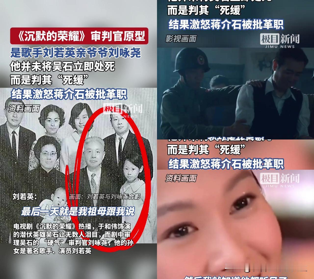 刘若英说,祖父走前最后一天,她唱了首没火的歌,爷爷的眼泪顺着皱纹流,她才懂那歌里藏着没说的话。 那首歌是《绿岛小夜曲》,爷爷是《沉默的荣耀》里审吴石的审判官,刘咏尧。当年蒋介石要“立斩”吴石,他偏判“死缓”,结果被革职。 平时爷爷总让她唱《黄埔军校校歌》,最后却要听这首。原来那歌里,有他想保吴石一命的遗憾,有时代洪流里身不由己的疼。 刘若英的“后来”里,藏着爷爷用丢官换的底气,人最珍贵的荣耀,从不在官职,而在敢对强权说“不”的硬气,是能在亲人面前露柔软的真诚。 你们有没有和长辈的专属歌曲?那首歌里,藏着他们哪段没说的故事?