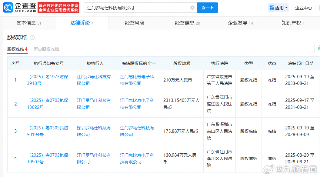 【#罗马仕所持2500万股权被冻结#】10月20日,从企查查APP获悉,近期,江门罗马仕科技有限公司新增多条股权冻结信息。其中,江门罗马仕科技所持江门惠比寿电子科技有限公司210万股权被广东省东莞市第三人民法院冻结、2313.15万股权被广东省江门市蓬江区人民法院冻结。此外,深圳罗马仕科技有限公司所持江门罗马仕科技公司175.88万被广东省深圳市南山区人民法院冻结。据悉,江门罗马仕科技有限公司由深圳罗马仕科技有限公司持股约98.9%,深圳罗马仕认缴813.9万元人民币。