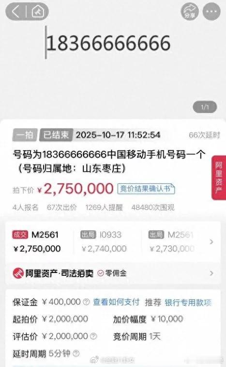 尾数八个6手机号被拍卖275万尾数为八个“6”的中国移动手机号以275万元的价格