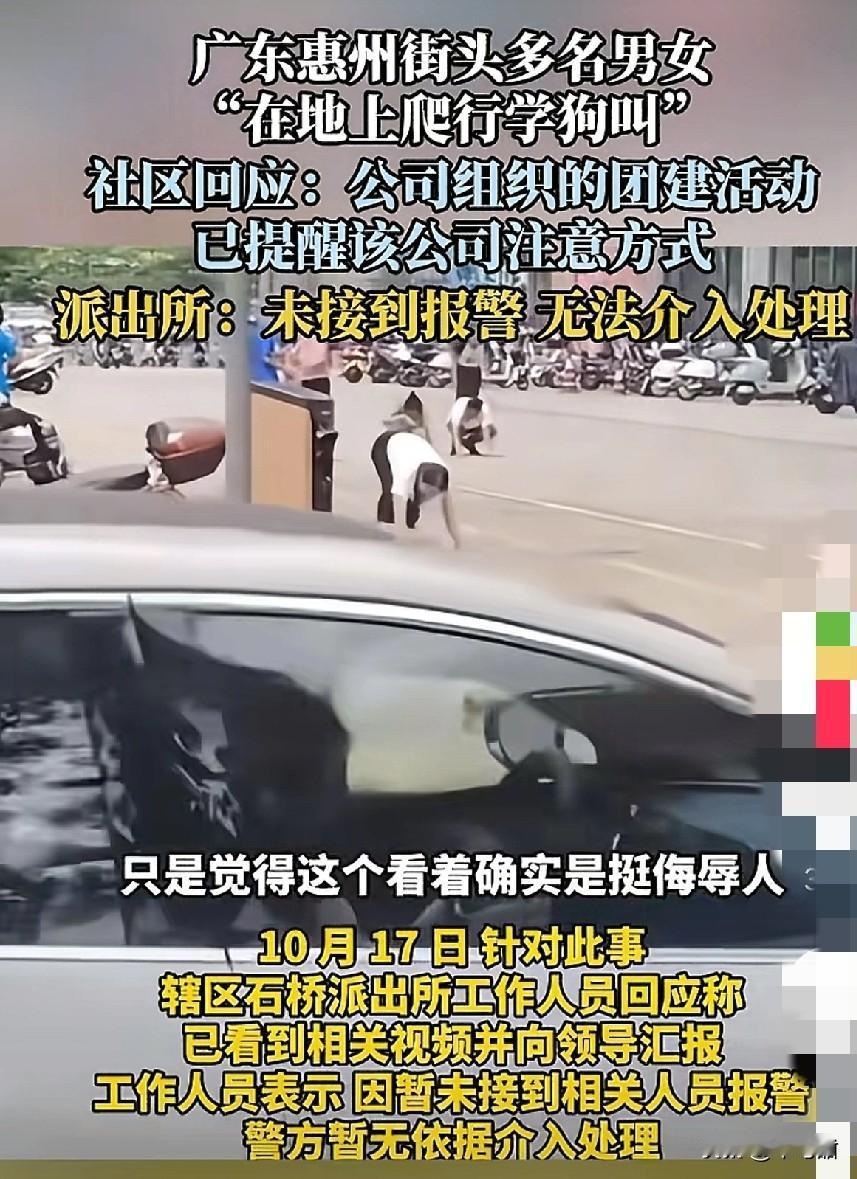 广东惠州街头,居然有多名男女当街爬行,还叫着“汪汪”。 这是谁的爸妈和儿女,这是非常“侮辱”人格的方式啊,由于没有人报案,当地警方无法介入,属于一个愿打一个愿挨的行为。 据了解,这是一家某教育咨询公司,公司开展了一场“突破自我”的团建活动,事件曝光后,公司已向社会公众公开致歉,据警方了解,只能劝导他们以后寻求更好的员工激励方式。 为了生活员工被迫营业,为了生存员工只能服从,公司的这些“团建”行为真的可取吗,为了挑战人的底线把自己做人的底线都抽走了,虽然不违法但是真缺德啊。 大环境因素,各地生意都艰难,光是为难员工有什么用,公司也应该拿出实在的诚意招揽生意,不要再花这些没用的心思给员工压力了,公司管理层也请好好做个人吧。 (图片来自网络视频)
