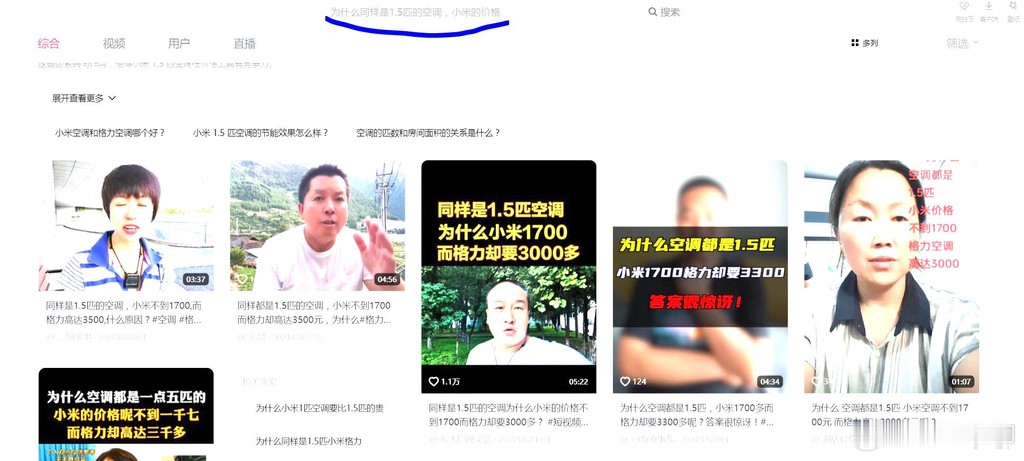 我抖音搜索了一下“为什么同样是1.5匹的空调,小米的价格”,点进去看,都是表面捧格力,实际说格力的价格虚高,吹小米空调好的。