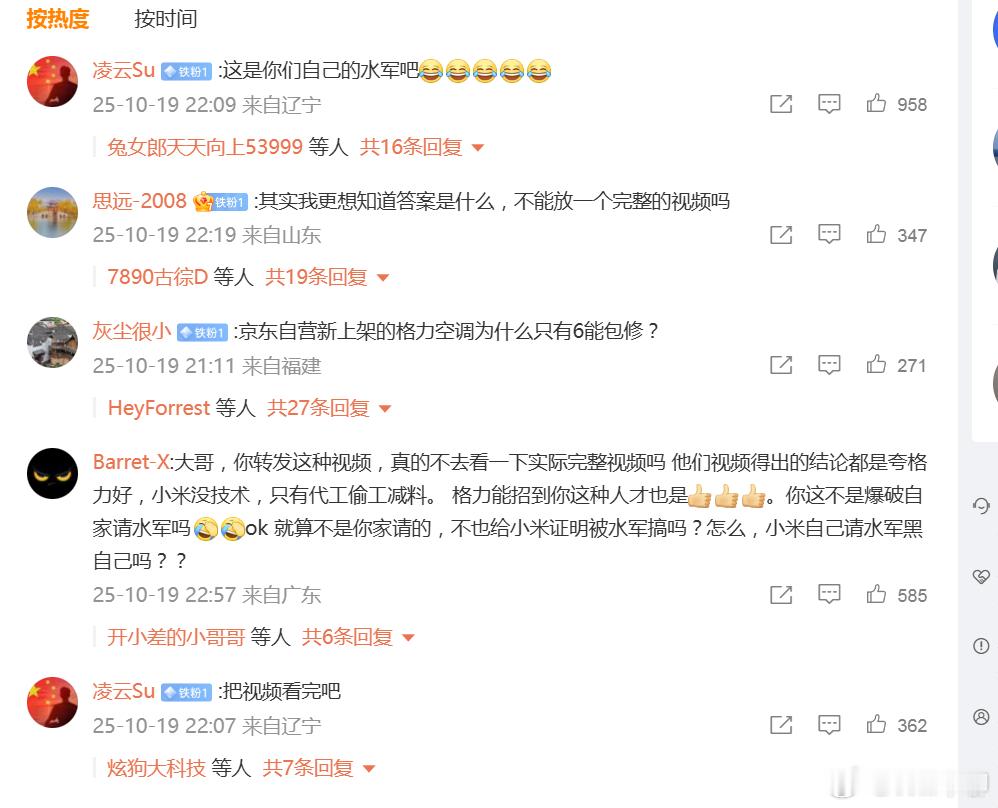 然后下面的评论,清一色的都说他微博说的视频有问题,说不是小米的水军,而是格力的水军……