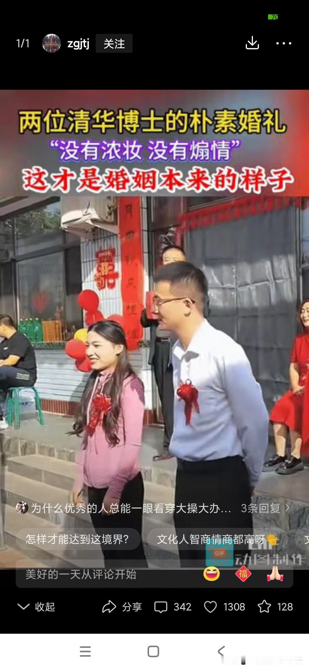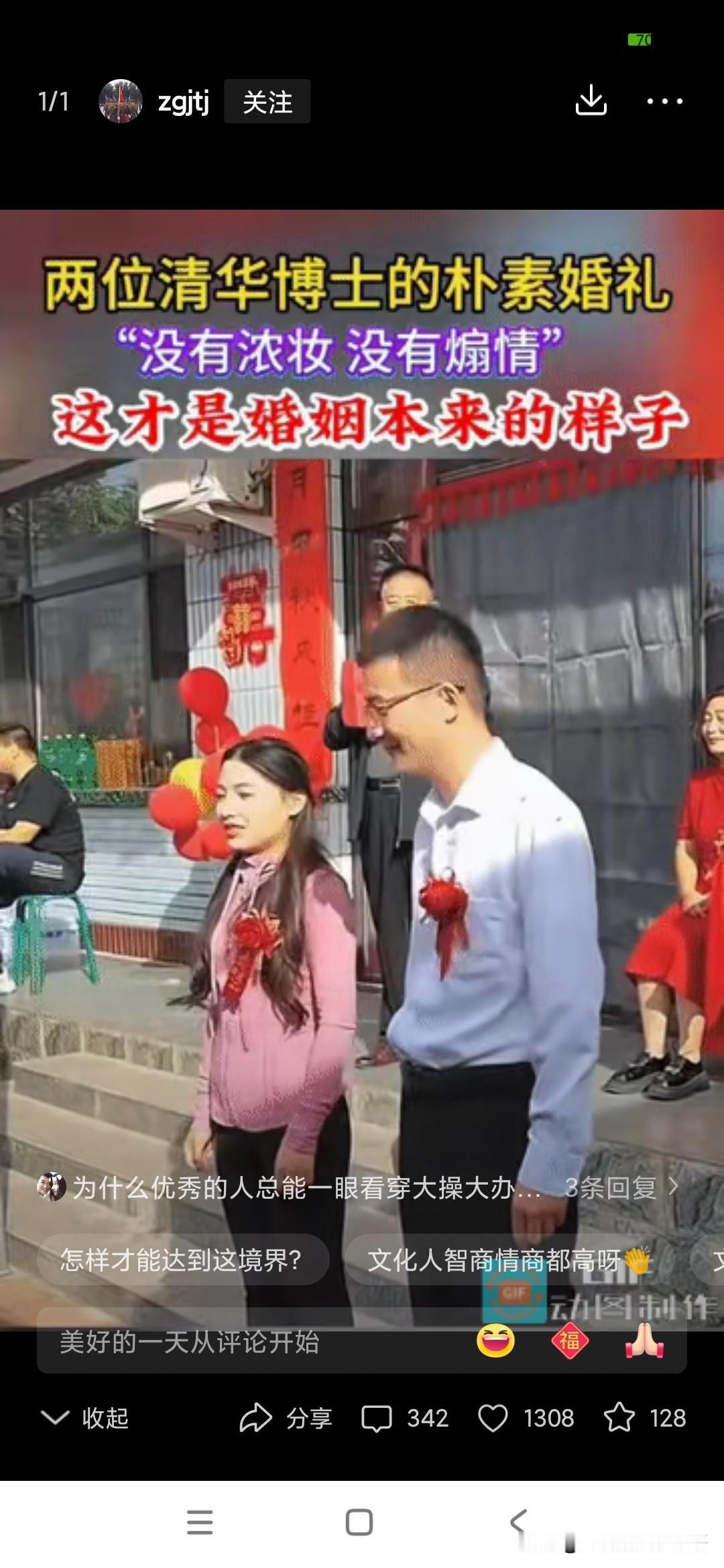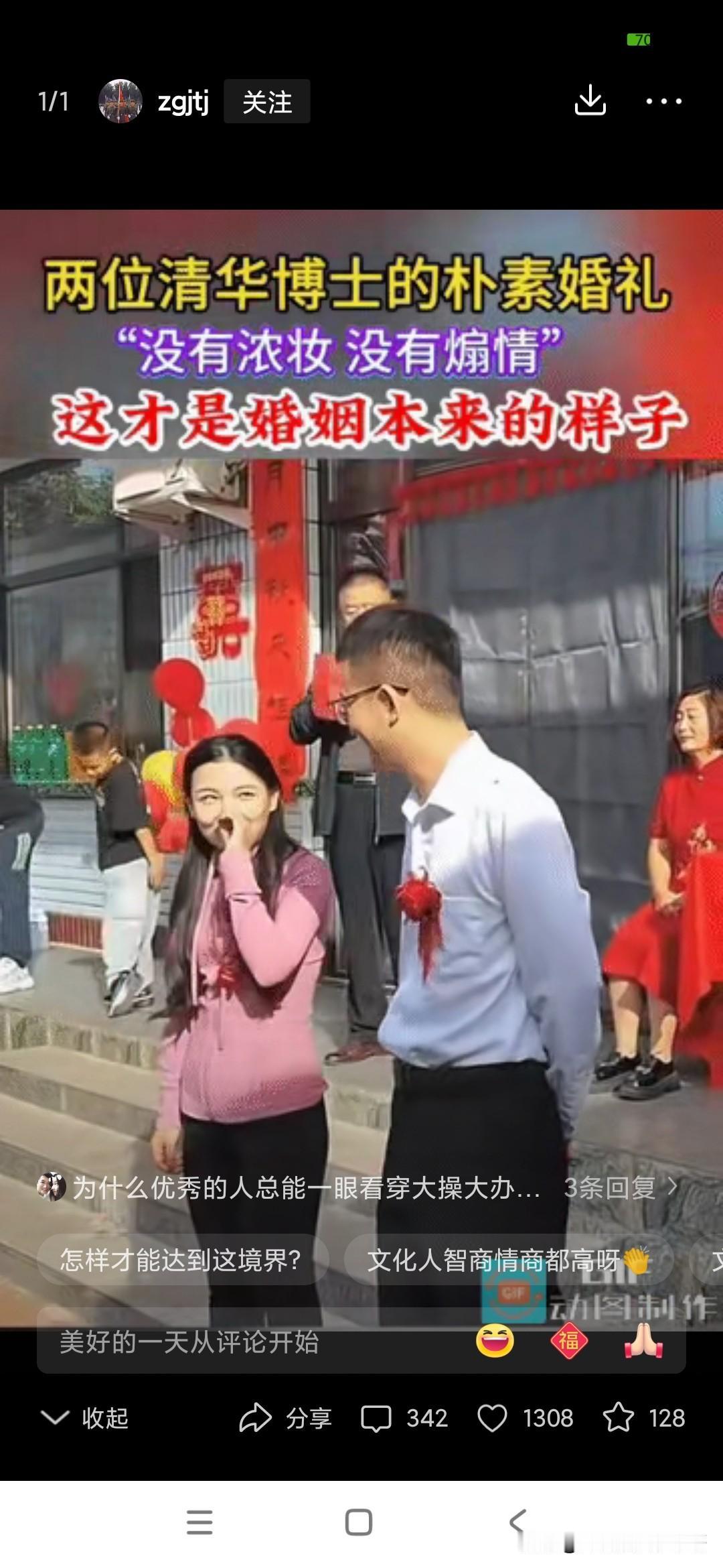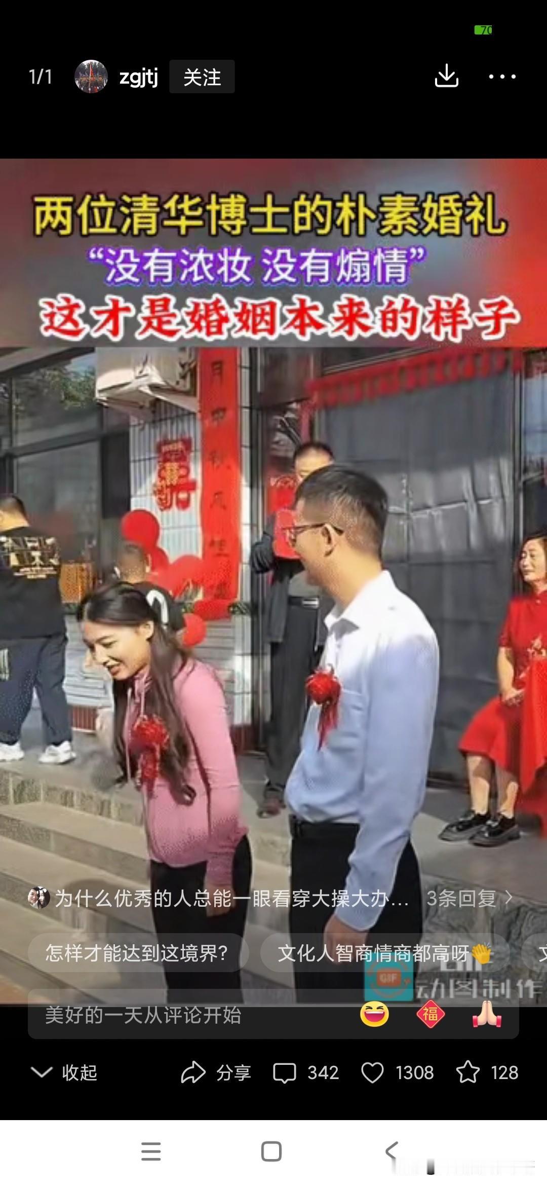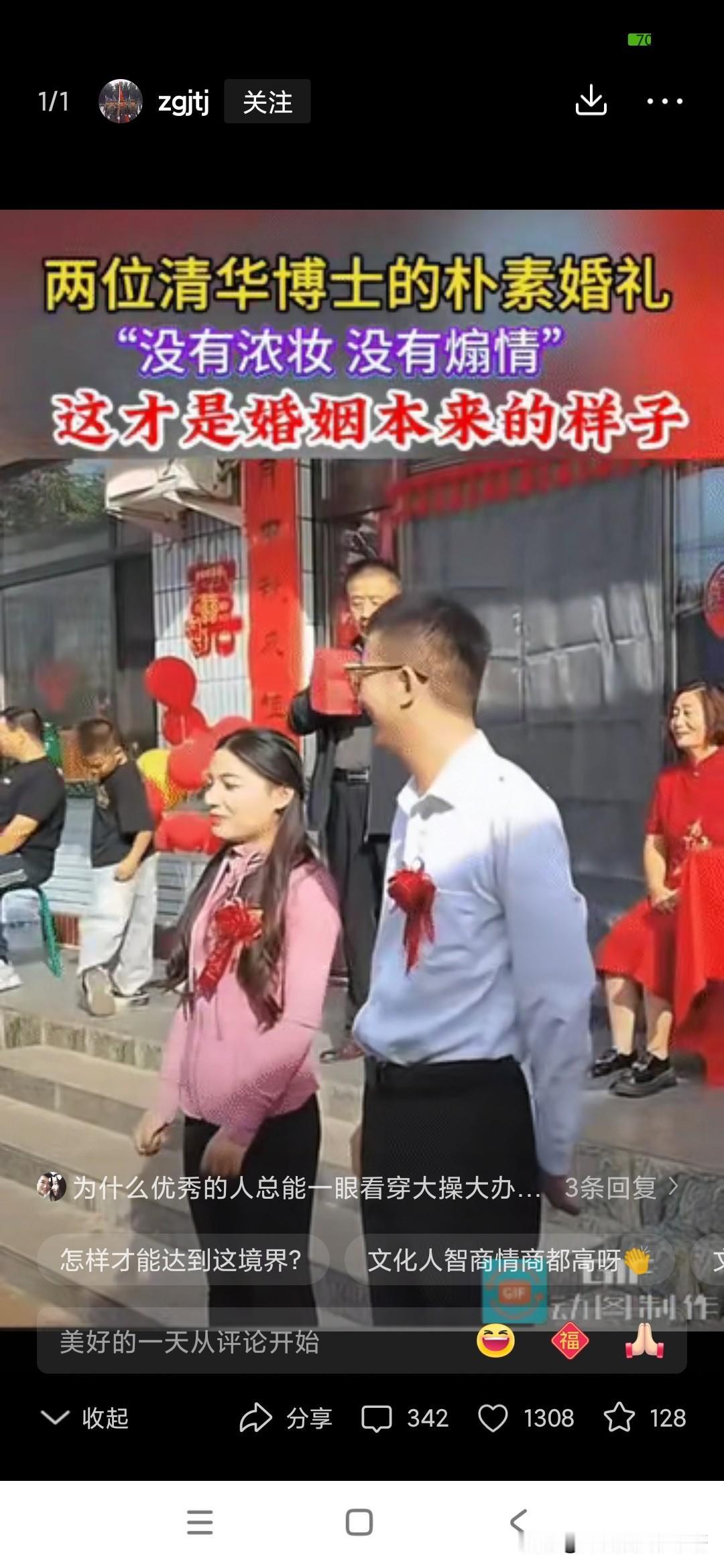 刚看到两位清华的博士结婚的视频,他们两个也没有穿西装西服或者是婚纱,只是在胸前别了一个新郎新娘的标志,他们的两对父母就坐在他们身后,他们向宾客,亲朋鞠躬致意,然后又向父母鞠躬感谢养育之恩,找了一个主持,也是村里的大叔,也可能是村主任的或者村支书之类的,整个过程非常简单,也没有专门找摄像,只是拍个照或者说是用手机摄个像而已,也没有请司仪或主持人,也没有说弄得那么别开生面,弄得那么感人,这么简朴,反而赢得了大家的尊重和瞩目,就是觉得学历越高的,见识越高的,认知越高的,似乎已经看透了婚姻的本质,而不在于这些表面性花里胡哨的东西,我挺佩服他们的,我也期待这样的婚礼!