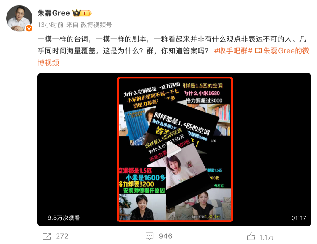 这些视频基本全是前半段渲染小米比格力便宜一半,后面又是再说格力用料好、有线下门店售后放心所以贵。