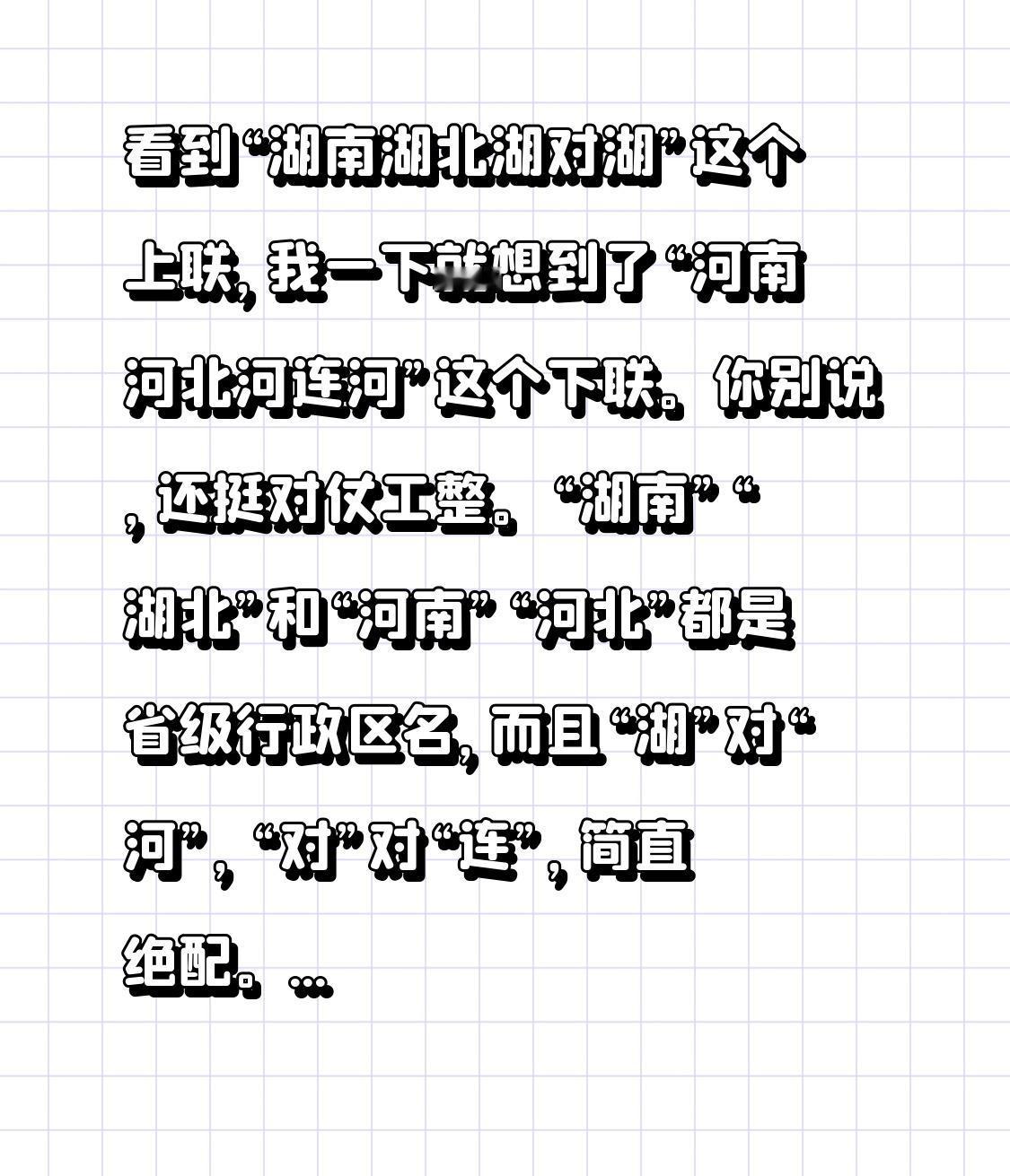 看到“湖南湖北湖对湖”这个上联,我一下就想到了“河南河北河连河”这个下联。你别说