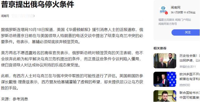 美媒披露普京停火条件!10月19日,据俄罗斯连塔网10月18日报道,美国《华盛顿