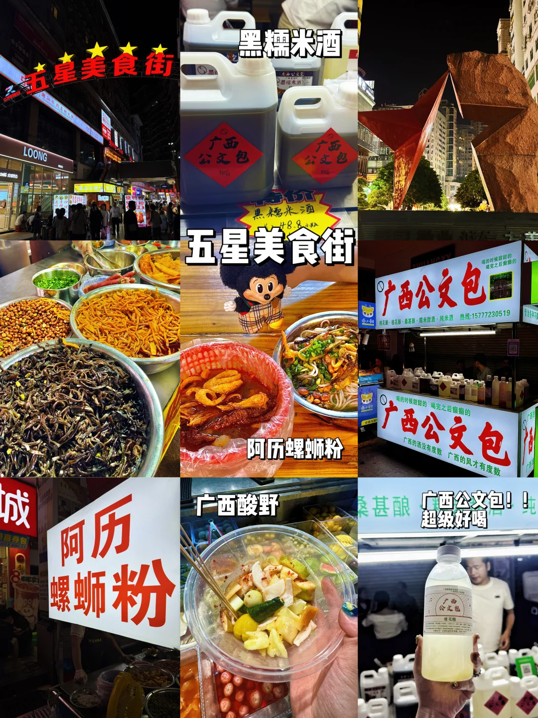 - 必吃推荐:张飞木薯羹、古早味爆浆巧克力蛋糕、阿历螺蛳粉、阿嬷手作(广西必打卡饮品店)。聚宝螺蛳粉、炒冰、广西公文包、