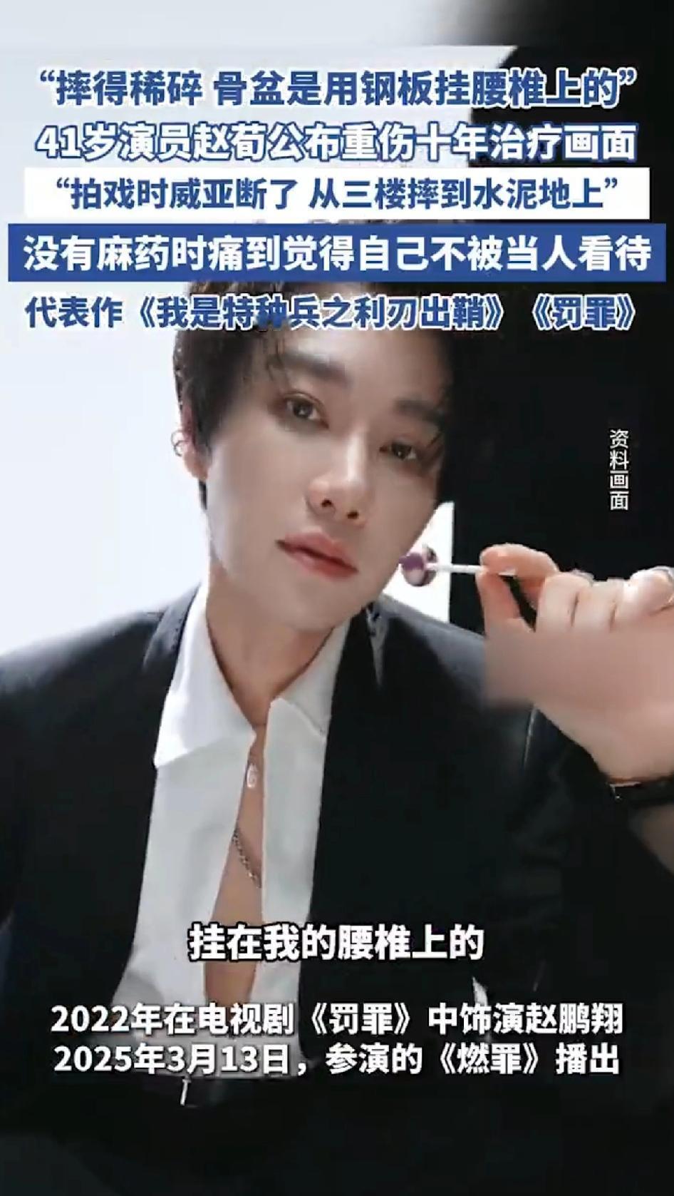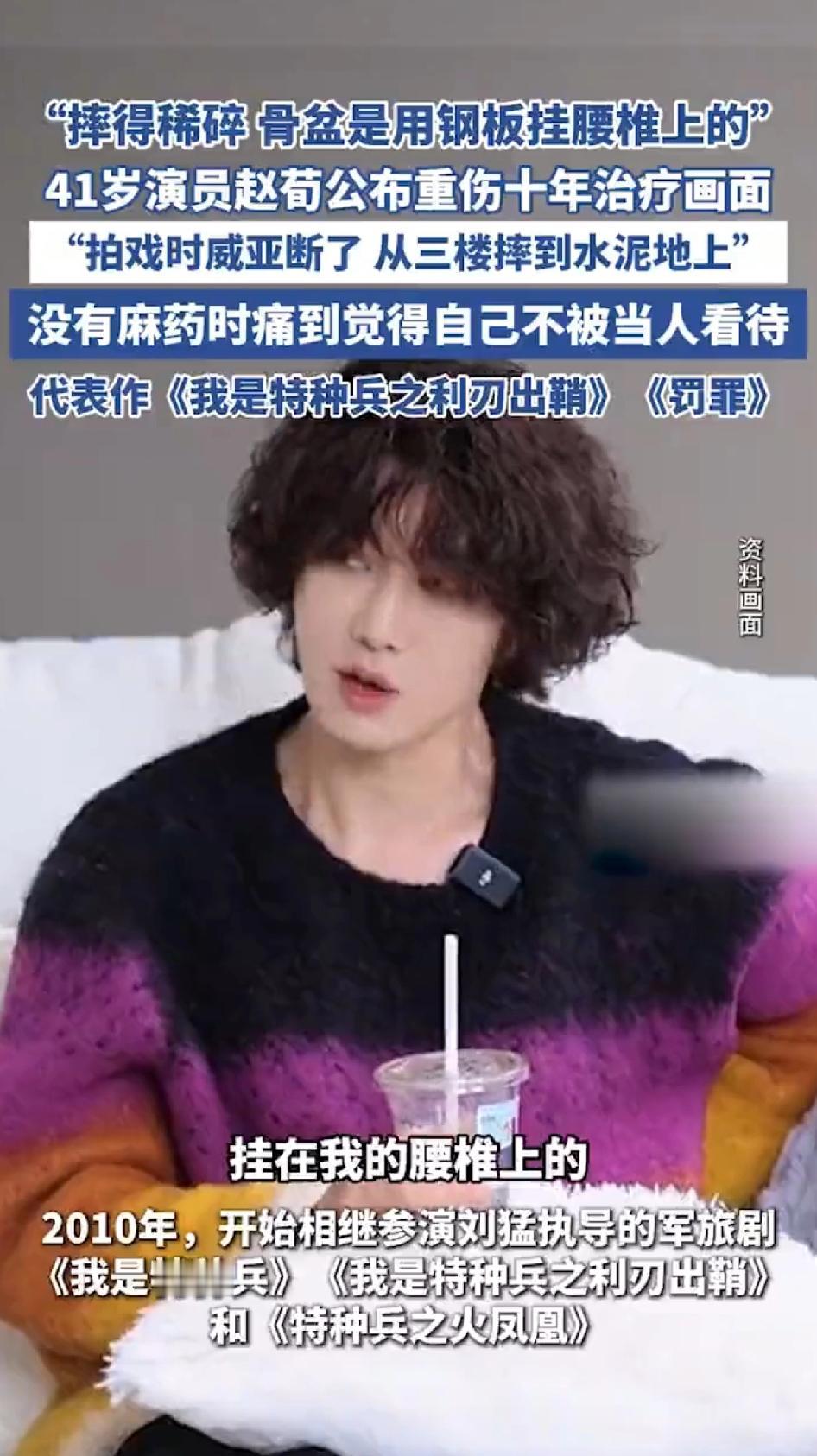 41岁的演员赵旬公布重伤十年治疗画面!“摔得稀碎 骨盆是总钢板挂在腰椎上的”!大臂已经撅过去了! “拍戏时威亚断了 从三楼摔到水泥地上”!没有麻药时痛到觉得自己不被当人看! 一下把大家拉回那段揪心往事。2015年拍《火线出击》时,他从10米高空坠下,颅内出血、左臂骨折、盆骨粉碎性骨折,抢救72小时才脱险,盆骨还打了三颗钢钉。 曾经他是《我是特种兵》里的李二牛,是军旅剧“硬汉专业户”,拍动作戏从不用替身。受伤后演艺事业暂停,可他没被打倒。 十年间,他从轮椅上站起,熬过康复训练的苦。如今他留着日系卷发、化着妆,和从前判若两人,却多了历经生死的通透,一句“活着就好”,道尽十年沧桑。 以前的李二牛现的赵旬,不光形象上的改变,心态改变,性格也变了! 一场事故不光是外貌上的改变!之前塑造了硬汉形象也无法继续延用! 难怪男明星都喜欢拍文艺剧,最起码没有危险!
