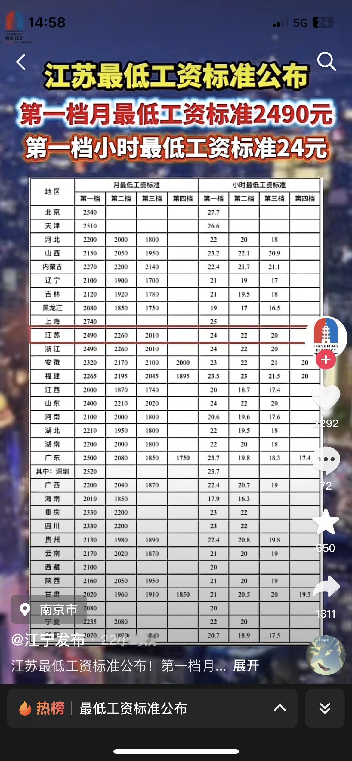 江苏打工人注意!最低工资标准又涨了!第一档月工资2490元,小时工24元! 咱来看看这数据,和上海、浙江持平了都!对比其他省份,这待遇真心不错。 这工资一涨,对咱们打工人来说,租房、吃饭压力是不是能小点儿? 你们觉得这最低工资标准够不够花?来评论区聊聊!”