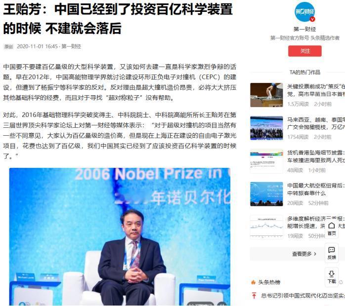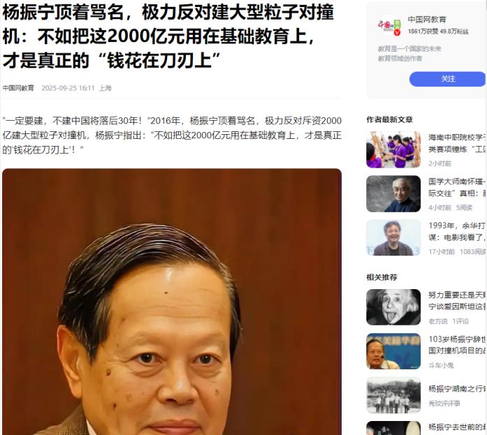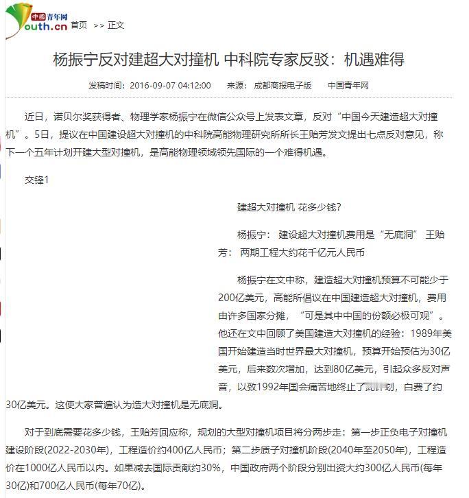 “一定要建,不建中国将落后30年!”2016年,杨振宁曾顶着骂名,极力反对花2000亿建大型粒子对撞机,杨振宁指出:“就算建成,也是给外国人做嫁衣,不如把这2000亿元用在基础教育上,才是真正的钱花在刀刃上!”中科院院士王贻芳却说:“一定要建,不建中国将落后30年。” 这场关于“千亿机器该建不该建”的争论,当年可是闹得沸沸扬扬,一边是中科院院士王贻芳拍着桌子说不建就落后三十年,一边是诺奖得主杨振宁顶着漫天质疑声泼冷水,两方差点吵翻天,谁也不让谁。 争议最先炸在钱上,杨振宁一开口就把预算拉到了200亿美元的级别,换算成人民币超过1300亿,还直言这数字大概率会像个无底洞。 他手里攥着美国的前车之鉴,上世纪90年代美国搞超导超级对撞机SSC,原定44亿美元的预算根本兜不住,最后砸了30亿还是烂尾,留下一片“科学废墟”,这账算下来确实让人心惊。 更戳人的是他提的现实差距,2016年中国人均GDP还赶不上巴西、墨西哥,几亿农民和农民工的民生需求摆在那,环保、医疗这些短板都等着补,千亿资金投进一台看不见产出的机器里,在他看来太不划算。 王贻芳当场就把账本拆解得明明白白,说杨振宁把两阶段的钱算在了一起。项目实际分两步走,首期正负电子对撞机CEPC只要400亿,后续质子对撞机SPPC就算建也得等到2040年以后,预算能控制在1000亿以内。 更关键的是有国际买单,他预估国际参与度能到30%,中国实际出资能压下来,每年30亿的投入占GDP比例,甚至不如上世纪80年代建北京正负电子对撞机时高。 他觉得这钱花得值,欧洲、美国早就在百亿级科学装置上布局了,中国GDP都快赶上欧洲了,装置规模还停留在十亿级别,不跟上就是主动落后。 科研价值的掰扯更不含糊。杨振宁直戳痛点,说高能物理界盼着找的“超对称粒子”就是个没根据的猜想,找了这么多年连影子都没有,用千亿机器去赌一个猜想里的猜想,纯粹是浪费。 他更直白地说,70年来高能物理的突破没给人类生活带来实在好处,短期内也看不到希望,与其砸钱在这上面,不如投给基础教育,那才是真正的固本培元。 王贻芳随手就举了两个硬例子,没有高能物理的发展,就不会有触摸屏技术,智能手机只能是空想;WWW网页也是欧洲核子研究中心搞对撞机时的副产品,现在带来的收益早超过了历史上对高能物理的全部投入。 他算过技术账,项目能带动高性能超导高频腔、大型低温制冷机这些核心设备的国产化,以前这些都得依赖进口,借着项目就能把技术短板补上。 更别提人才,项目能聚拢几千名顶尖研究者,还能吸引国外科学家来华,这可是花钱买不来的科研生态。 经费挤压的问题成了另一个吵架焦点。杨振宁担心这千亿投入会把其他基础学科的经费抢光,毕竟好钢就这么多,都给了对撞机,生物、化学这些领域就得饿肚子。 王贻芳却觉得这是多虑,当时中国基础研究经费占研发总经费的比例才5%,比发达国家的15%差远了,光是填补这个缺口每年就有上千亿的增长空间,根本不至于让对撞机和其他学科抢饭吃。 国际合作的性质也成了争论点。杨振宁说的“给外国人做嫁衣”不是空穴来风,王贻芳自己也承认国际科研人员参与度会超过50%,核心研究说不定要被外人主导。 但王贻芳看得更远,他知道中国的CEPC和欧洲的FCC是直接竞争关系,谁先建成谁就掌握话语权,要是让欧洲抢了先,中国在高能物理领域至少落后30年。而且项目能让中国成为国际科学中心,这种影响力可不是钱能衡量的。 两方的底气其实都藏在各自的判断里。杨振宁见过太多大型项目的失控,更清楚当时中国的发展阶段需要务实;王贻芳盯着的是科技竞争的未来,知道量级提升是必经之路。 这场争论到最后也没个定论,但那些摆出来的数据和案例,倒是让普通人看清了千亿投入背后的权衡与博弈。