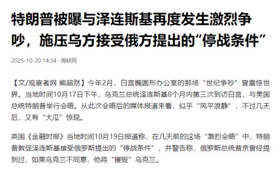 《金融时报》报道,10月17日,特朗普在与泽连斯基会晤的过程中,一直在施压泽连斯基,要求他割让一些领土,以立刻结束战争,双方为此爆发了激烈争吵,特朗普多次训斥泽连斯基,会谈不欢而散。 泽连斯基这次去美国,核心就是想说服对方提供射程超过 1600 公里的 “战斧” 巡航导弹,这种武器能直接打到俄罗斯境内的军事目标,对乌军突破前线的僵局特别重要。 之前特朗普还释放过一些模糊的信号,让乌克兰那边看到了希望,可就在会晤前一天,特朗普跟普京通了两个半小时的电话,这下风向彻底变了。 会谈刚一开始,特朗普就给泽连斯基泼冷水:“美国自己的‘战斧’导弹都不够用,现在肯定不能给你们。” 他甚至直接说,给这种武器 “可能会让局势变得更糟”,而美国现在更想看到的是 “赶紧停火”。 这种态度上的转变,让乌克兰代表团一点准备都没有 —— 原本计划的 “靠武器推进谈判” 的思路,突然就变成了 “靠谈判避免打仗” 的妥协路子。 更让泽连斯基心里发寒的是,特朗普在会谈里反复强调 “就地停火” 多重要,甚至把战场地图扔到一边说 “这些都没用,普京已经赢了”。这种立场跟他几个月前说 “乌克兰能把所有领土都夺回来” 的话完全不一样,欧洲官员都说这是 “完全倒向俄罗斯那边了”。 特朗普在会谈里提出的 “和平方案”,核心就是让乌克兰拿顿巴斯地区 78% 的领土来换停火协议,要知道那部分现在还被俄罗斯控制着。 他甚至直接搬来普京的话威胁泽连斯基:“要是不同意,俄罗斯会把你们打垮。” 这种 “帮别人传话谈判” 的方式,让乌克兰代表团既觉得屈辱又没办法。 根据《金融时报》的消息,特朗普在会谈里还多次说脏话,训斥泽连斯基 “必须接受现实”。他甚至把普京提出的 “领土交换” 方案摆到桌面上 —— 让乌克兰放弃顿涅茨克,俄罗斯则归还赫尔松的部分地区。 这种提议看着像是 “双方各退一步”,实际上是让乌克兰丢了东部的工业核心区,彻底改变了当地的地缘格局。 面对这种压力,泽连斯基的表态特别矛盾,他一边承认 “领土问题又敏感又难办”,另一边又强调 “加入北约对乌克兰来说还是很重要”。 这种两边摇摆的态度,既想保住西方的支持,又不想背上 “卖国” 的骂名,刚好能看出乌克兰在大国博弈里有多尴尬。 这次没谈拢的会晤,对乌克兰的影响可不浅。一是军事援助的不确定性变得更严重了,原本盼着的 “战斧” 导弹没拿到,美国反而开始推动欧洲盟友通过 “乌克兰优先需求清单” 这个机制去买美国造的武器,可法国、英国这些大国到现在都没给出承诺,这种 “甩锅” 的做法,让乌克兰不得不面临 “武器断供” 的风险。 二是乌克兰国内的政治危机也升级了,泽连斯基要是接受了割地的协议,肯定会引发民众的强烈抗议,可要是不接受,又可能失去美国的支持,这种两难的处境被俄罗斯巧妙利用了,普京在跟特朗普通话的时候,特意提出了 “顿涅茨克完全归俄罗斯” 这种苛刻条件,进一步把乌克兰内部的矛盾给激化了。 在国际层面上,特朗普立场的转变也让欧洲盟友很担心,欧盟虽然嘴上说支持乌克兰,可对 “战斧” 导弹可能引发的冲突外溢特别害怕。 更让欧洲不安的是,特朗普和普京已经定好了要在匈牙利举行面对面的会晤,可乌克兰能不能受邀还不知道,这种 “背着乌克兰谈乌克兰” 的做法,让欧洲很担心自己的利益会被忽视。 从地缘博弈的深层逻辑来看,特朗普提出的 “割地换和平” 策略,背后其实是美国战略重心的调整。眼看着大选要来了,特朗普需要一个 “结束战争” 的政绩来稳住支持率,至于乌克兰的领土完整,显然不在他优先考虑的范围内。 就像欧洲官员说的,特朗普更关心的是跟俄罗斯重新搞好关系,他甚至还提过要跟俄罗斯一起开发白令海峡的资源。对俄罗斯来说,这可是一场 “用空间换时间” 的胜利,通过控制顿巴斯,俄罗斯不光拿到了战略缓冲带,还能长期影响乌克兰的政治。 更关键的是,特朗普的妥协让俄罗斯在谈判桌上占了上风 —— 普京只要维持住现在的战线,就能等着乌克兰因为内部分裂而垮掉。对乌克兰来说,这场危机刚好暴露了他们 “靠别人帮忙搞外交” 的致命问题,太依赖西方的援助,导致乌克兰在谈判里根本没什么议价能力。 这场白宫会晤不只是美乌关系的转折点,更是俄乌冲突的分水岭。当 “战斧” 导弹变成了谈判的筹码,当领土主权成了交易的工具,乌克兰的命运,慢慢就不在自己手里了。