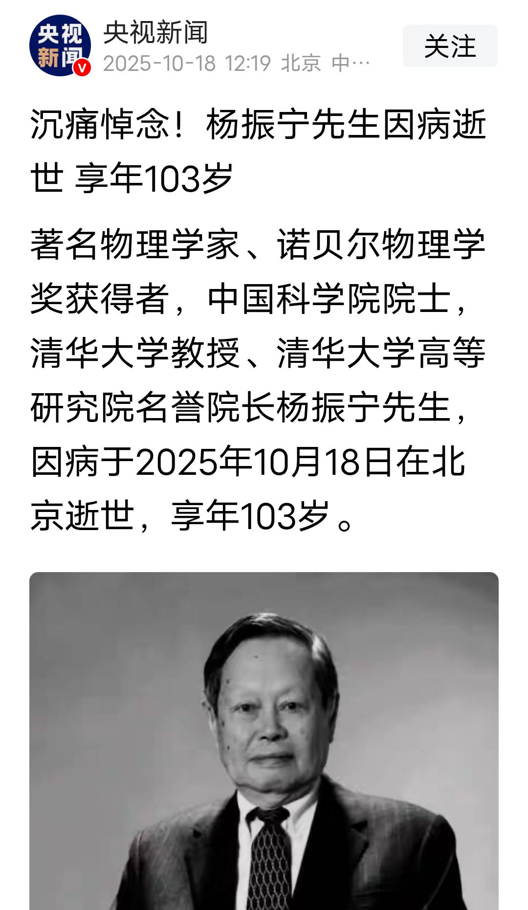 2025年10月18日,一则沉痛的消息传来——著名物理学家杨振宁在北京逝世,享年