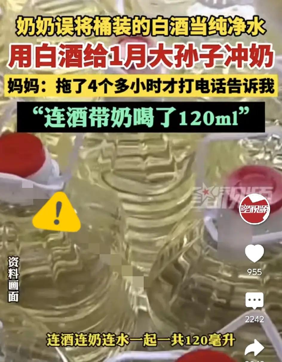 9月26日,贵州罗甸一名刚满月的男婴因奶奶误将桶装白酒当作纯净水冲泡奶粉,被喂下