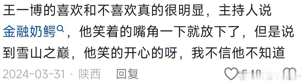 主要是王一博听完后不仅笑 他还点头了 特别明显 听到雪山之巅是真的很开心 明晃晃的偏爱🥰🤲🏻